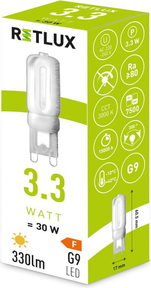 LED žárovka Retlux je úsporná a překvapí svou dlouhou životností až 15000 h. Na rozdíl od běžných žárovek produkuje jen malé množství tepla, a navíc ihned po zapnutí svítí bez viditelného blikání. Obsahem balení je jedna LED žárovka. Hlavní vlastnosti produktu RETLUX RLL 460 G9 3,3W LED WW LED žárovka Retlux nabízí jak skvělou svítivost, tak minimální spotřebu elektrické energie Po zapnutí se okamžitě rozsvítí, aniž by blikala Její příkon je 3,3 W LED žárovka Retlux má patici G9 Tvar: kapsle Světlo má chromatičnost 3000 K Světelný tok činí 330 lm Její hodnota indexu podání barev (CRI) je 80 Ra ze 100 možných V balení dostanete jednu LED žárovku Pořiďte si správnou žárovku podle světelného toku a CRI Důležitým aspektem při výběru LED žárovky je světelný tok, jelikož určuje míru osvětlení daného prostoru. Vyšší hodnota světelného toku odpovídá intenzivnějšímu osvětlení, které žárovka poskytuje. Tento parametr se obvykle pohybuje v rozmezí od nízkých stovek, například 200 lm do nižších tisíců, kupříkladu 2...