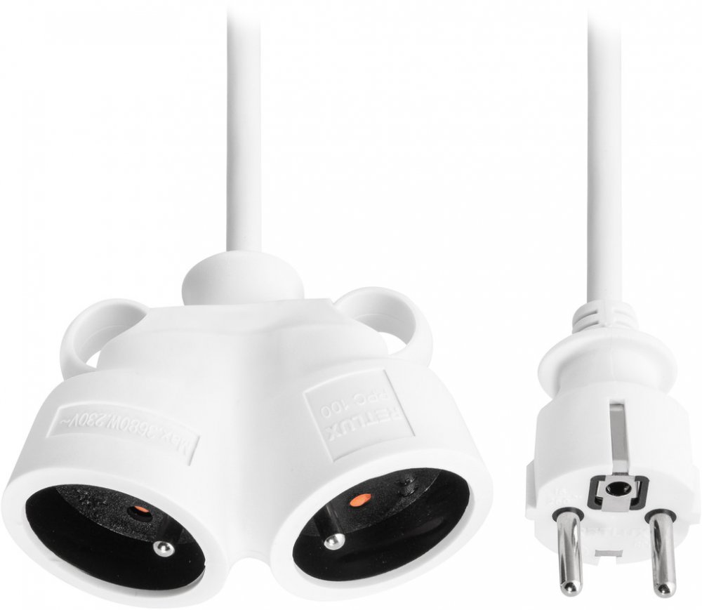 Dvoumetrový prodlužovací kabel RPC 100 s průchodkou, jednou zástrčkou a dvěma zásuvkami do „V“. U zásuvek jsou zalisována plastová očka pro snadnější manipulaci vytažení zástrček. Produkt obsahuje vodiče s parametry 3 x 1,5 mm2 a s maximálním proudem , zátěží 16A /3 680 W.