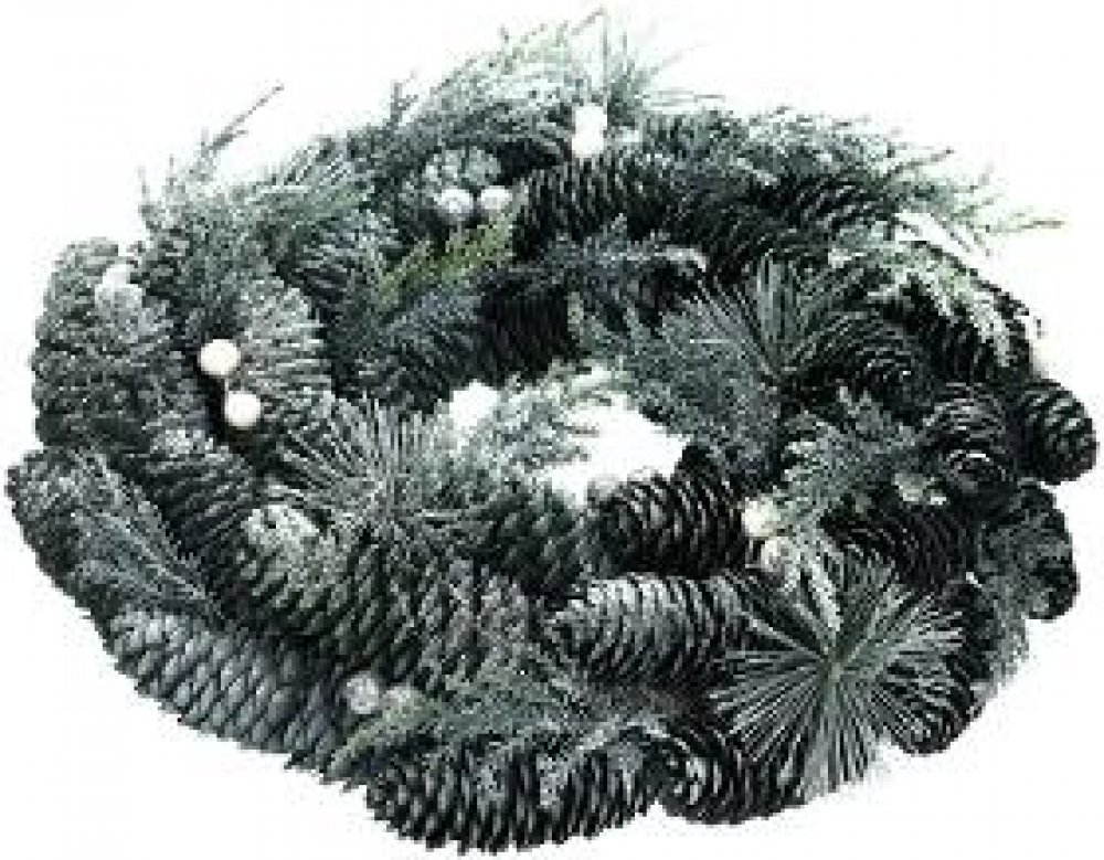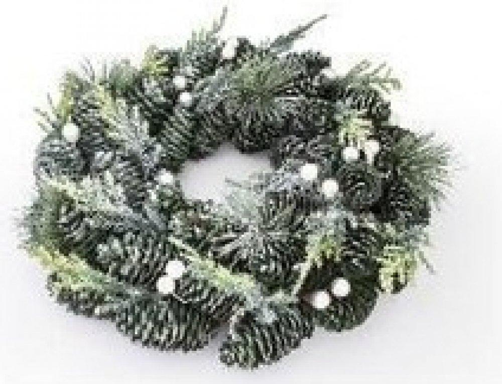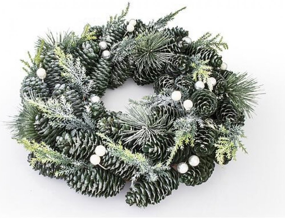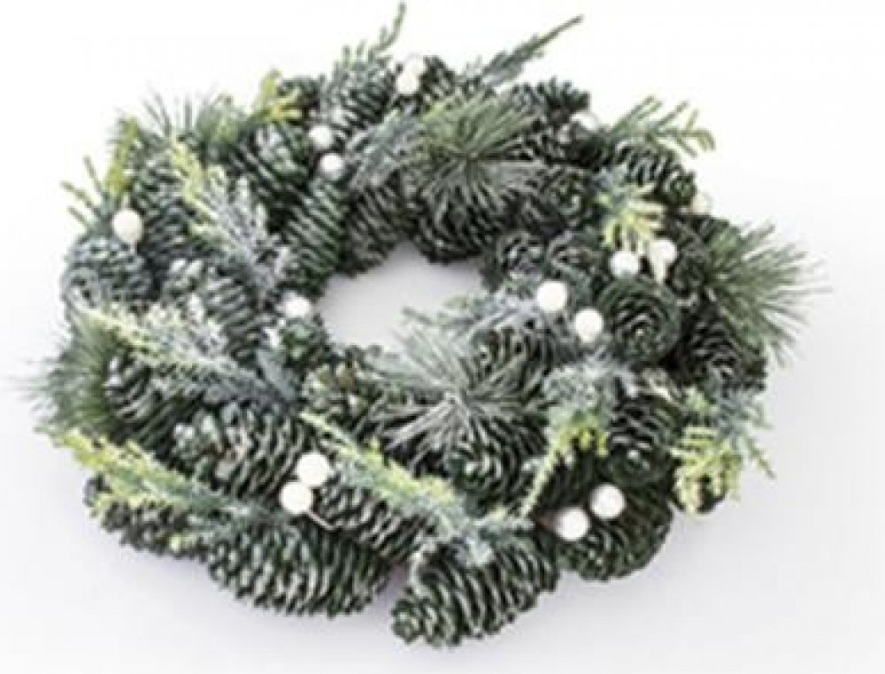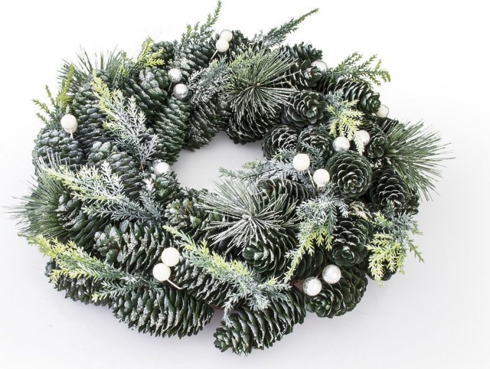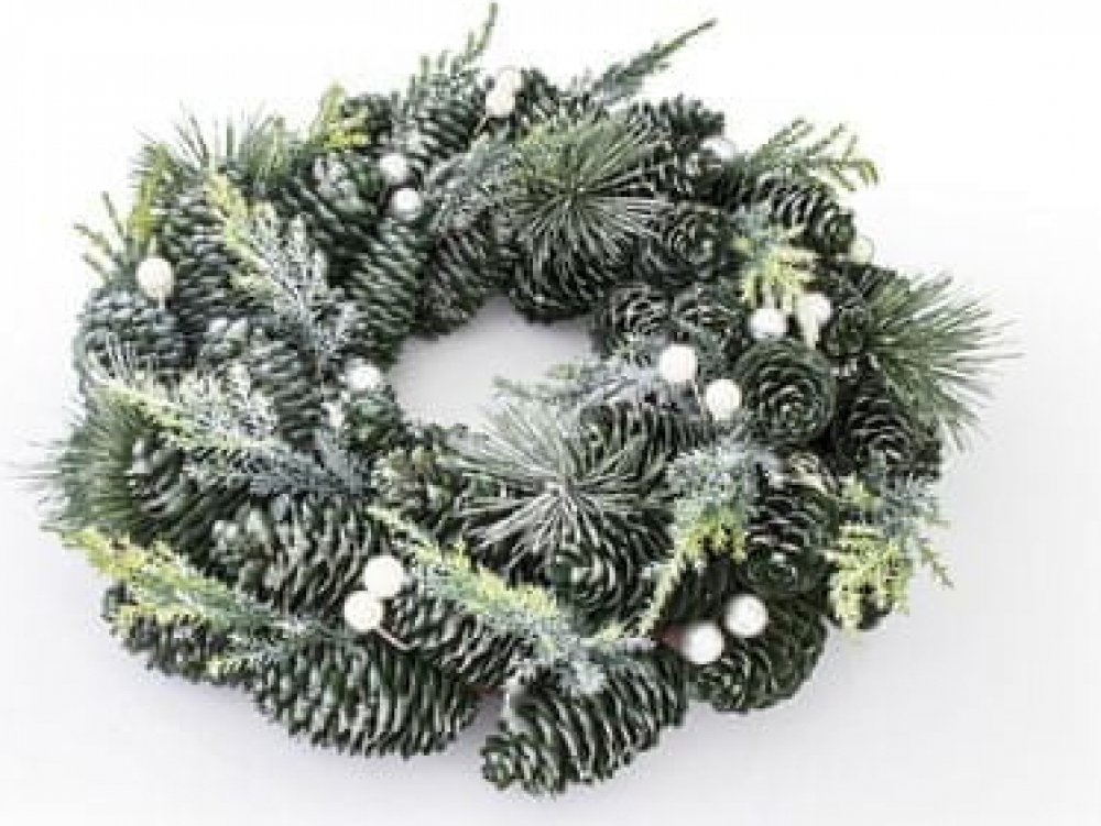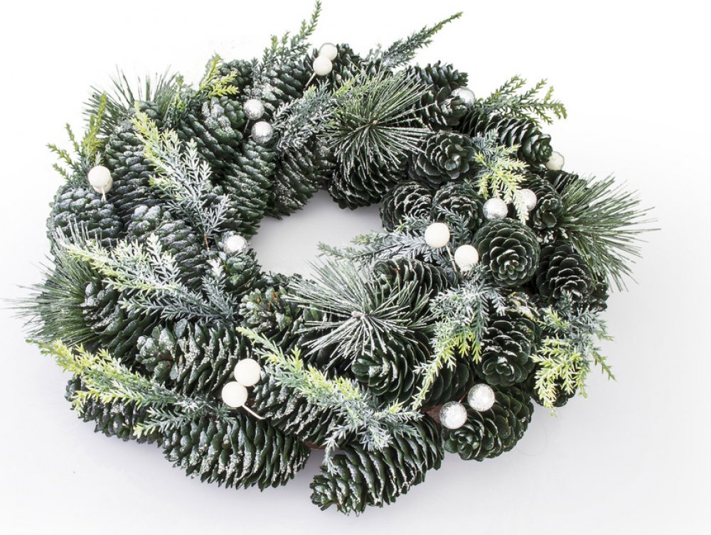 Jeho průměr činí 33 cm a je tvořen umělým chvojím a zelenými šiškami.