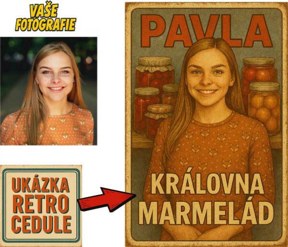 ? Z vaší fotky uděláme retro poklad! Stačí nám nahrát fotografii, připsat text, který chcete na ceduli mít – a my už se postaráme o originální grafiku, která bude mít styl, šmrnc a duši.