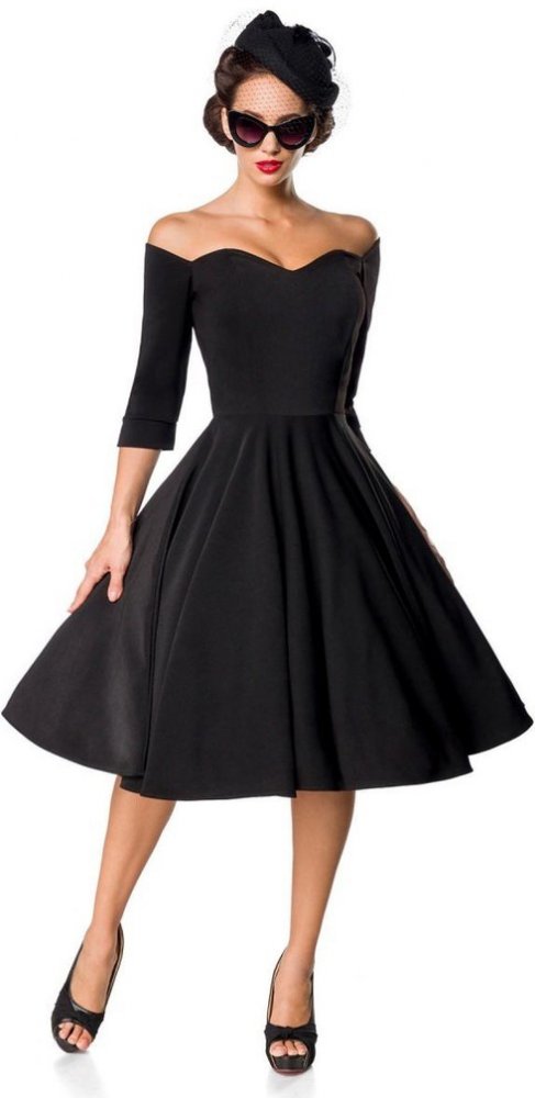 Elegantní černé společenské šaty retro styl 3/4 rukáv výstřih Carmen do písmene V ozdobný pásek, který lze odejmout kolová bohatá sukně vhodné doplnit o spodničku na zadním díle zapínání na skrytý zip délka ke kolenům jemně elastický materiál vhodné k různým příležitostem jako je ples, večírek, atd. nejvyšší kvalita od značky Belsira Spodnička není součástí produktu Materiál: 80% polyester, 20% e...