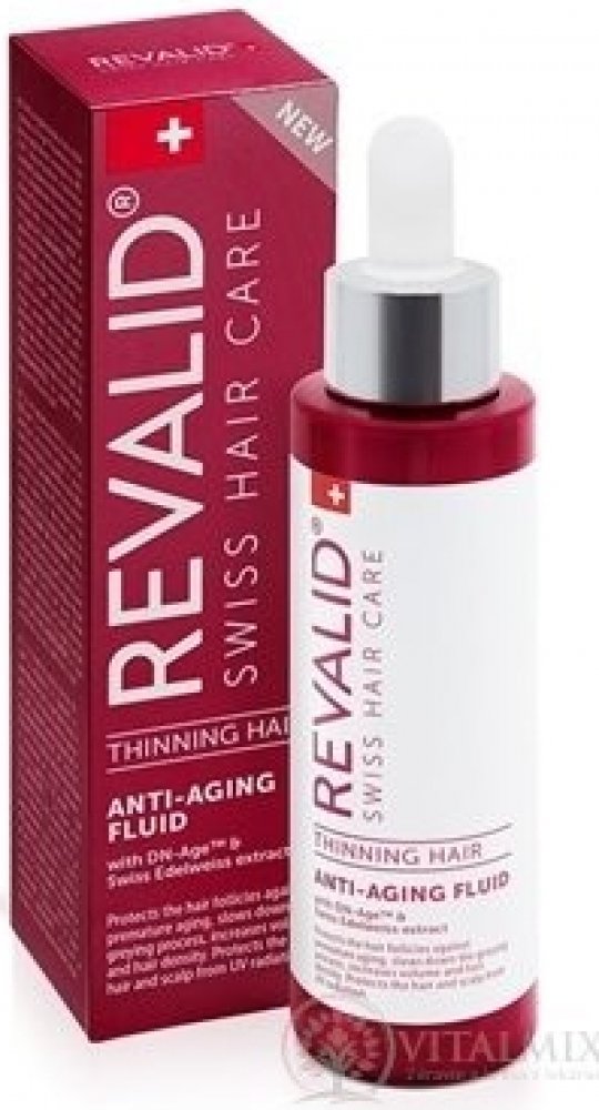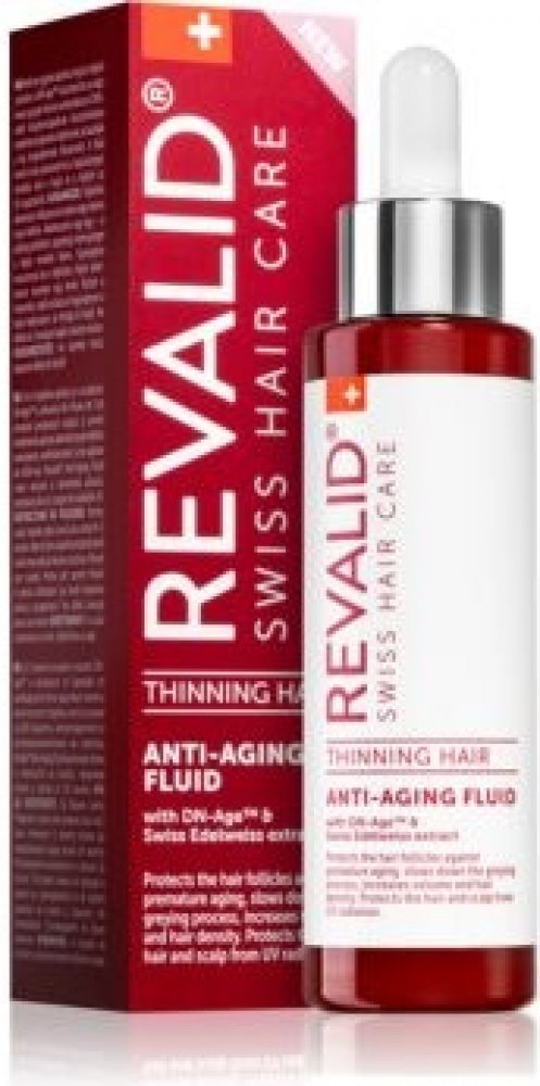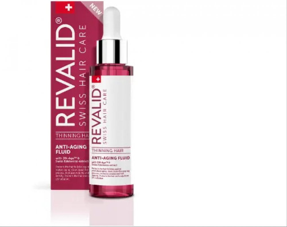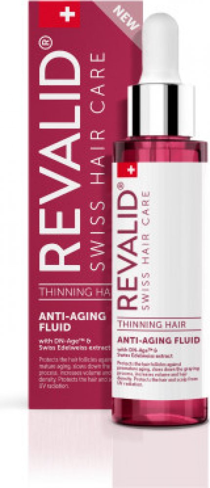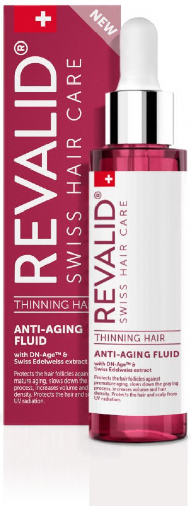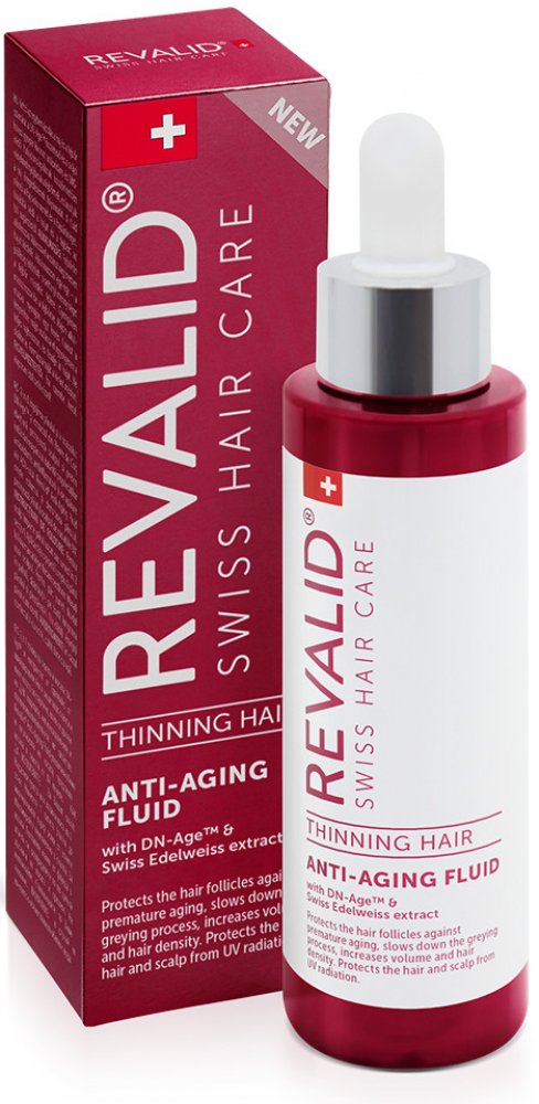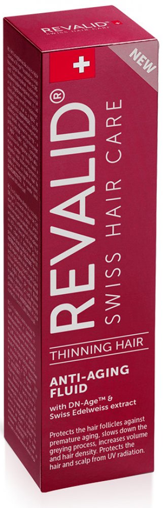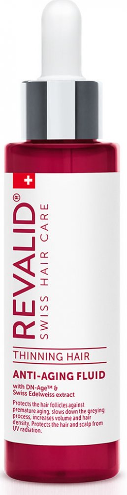 Revalid® Anti-Aging Fluid tak chrání pokožku hlavy před předčasným stárnutím a snižuje oxidační stres ve vlasových folikulech. To zpomaluje proces šedivění vlasů, zvyšuje jejich objem a hustotu a chrání vlasy a pokožku hlavy před škodlivým UV zářením.