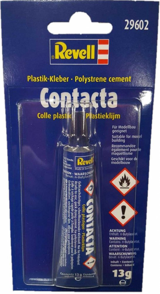Revell Contacta je gelové lepidlo v tubě. Jeho výhodou je to, že velké díly můžete přesně umístit ještě před tím, než lepidlo zaschne.