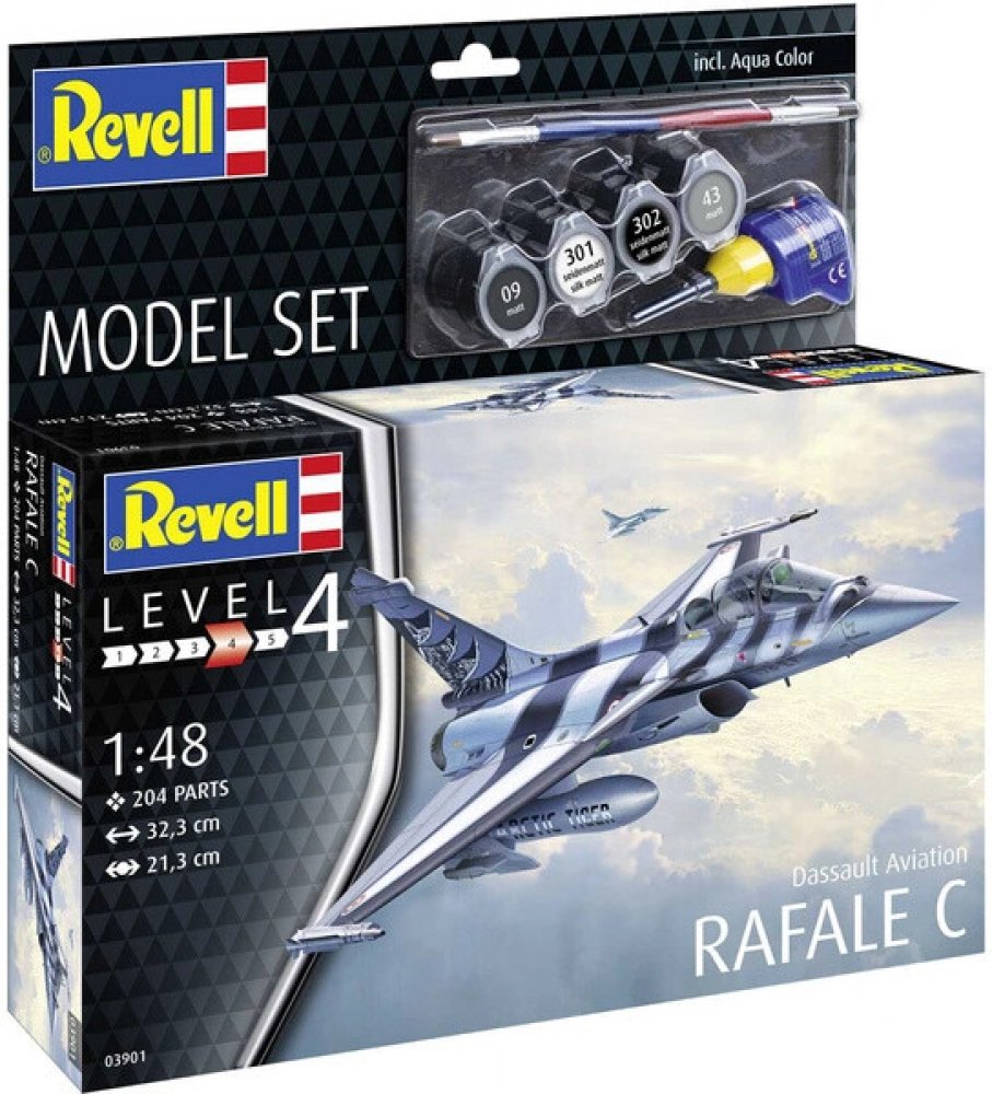 Plastikový model Revell 63901 – letadlo Dassault Rafale C v měřítku 1:48 ke slepení. Stavebnice obsahuje 204 dílků, rozpětí křídel 213 mm, obtížnost 4.