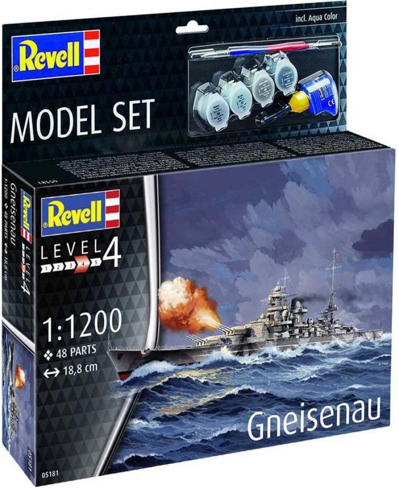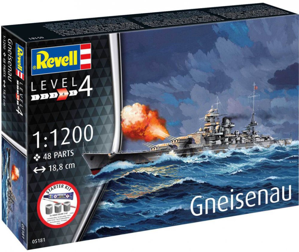 Plastikový model lodi BATTLESHIP GNEISENAU REVEL 75181 ke slepení. Velikost: 1:1200; 188mm. Balení obsahuje: 48 dílků ke slepení+ barvy + lepidlo + štětec.