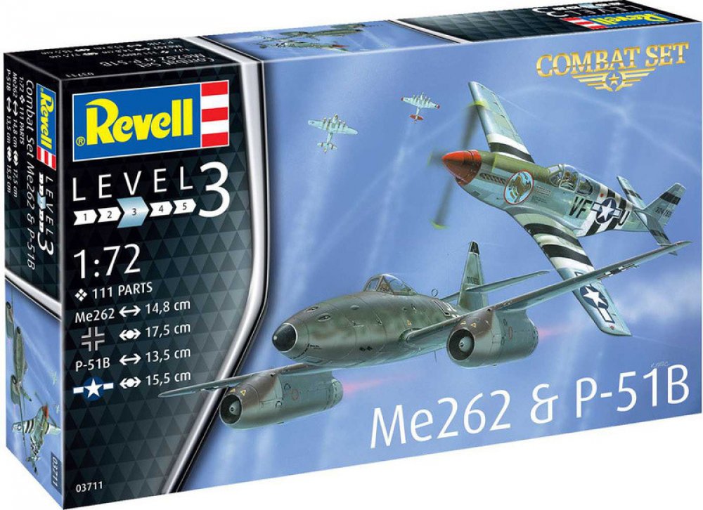 Modely letadel ke slepení. Velikost: 1:72; 14,6 a 13,5 cm. Balení obsahuje: 111 dílků ke slepení, lepidlo, štětec a barvičky. Informace o modelech: Doporučené barvy: základní: 115, 136, 145, 105, 155, 157, 165, 166, 109 další: 116, 147, 148, 106, 184, 189, 199 Detaily modelu: Měřítko: 1:72 Počet dílů: 111 Délka: Me262 - 146 mm, P-51B - 135 mm Obtížnost: 3 Doporučeno pro děti od 10 let. Upozornění: Nebezpečí udušení! Výrobek obsahuje malé části. NEVHODNÉ PRO DĚTI DO 3 LET! Akrylová barva pro modeláře Revell Aqua Color (5 ml) Návod na použití: Vodou ředitelná akrylová barva. Před použitím barvu dobře promíchejte. Nanášejte štětcem, nebo stříkáním na suchý, čistý povrch. Nehořlavá báze, rychle zasychá – nebarvitelné po 1 hodině, úplně uschne za 2–3 hodiny, podle tloušťky vrstvy. V případě potřeby zřeďte vodou. Použitím nevhodného ředidla se může barva zničit! Čistí se ředidlem Revell Aqua Color Clean. Na stříkání se doporučuje ředění maximálně 20 - 25 %. Štětec a pomůcky ihned po použití vypláchněte vodou. Nádobku po použití pevně uzavřete. Po otevření spotřebujte co nejdříve, barva přístupem vzduchu zasychá. Chraňte před mrazem. Obsahuje Směs látek 5-chlor-2methylisothiazol-3(2H)on a 2-methylizothiazol3(2H)-on s chloridem hořečnatým a dusičnanem hořečnatým. Může vyvolat alergickou reakci. Upozornění: Uchovávejte mimo dosah dětí. Zneškodněte tento materiál a jeho obal ve sběrném místě pro zvláštní nebo nebezpečné odpady. Pozor! Nevhodné pro děti do 8 let. Děti mohou výrobek používat pouze pod dohledem dospělé osoby. Tekuté lepidlo na plasty Revell Contacta Professional Návod na použití: Vhodné na přesné lepení sestavovaných modelů. Balení s jehlovým aplikátorem. Lepidlo naneste na jednu plochu. Lepené plochy k sobě přitlačte mírným tlakem. Spoj schne 5-10 sekund, dokonale vytvrdne do 1 hodiny. Přečtěte a uschovejte. Varování! Obsahuje: n-Butylacetat. Hořlavá kapalina a páry. Může způsobit ospalost nebo závratě. Je-li nutná lékařská pomoc, mějte po ruce obal nebo štítek výrobku. Uchovávejte mimo dosah dětí. Před použitím si přečtěte údaje na štítku. Chraňte před teplem/jiskrami/otevřeným plamenem/horkými povrchy. Zákaz kouření.Tento výrobek není hračka!