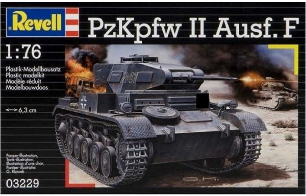 Plastikový model Revell 03229 – Tank II Ausf.F v měřítku 1:76 ke slepení. Stavebnice obsahuje 61 dílků, délka 63 mm, obtížnost 3.