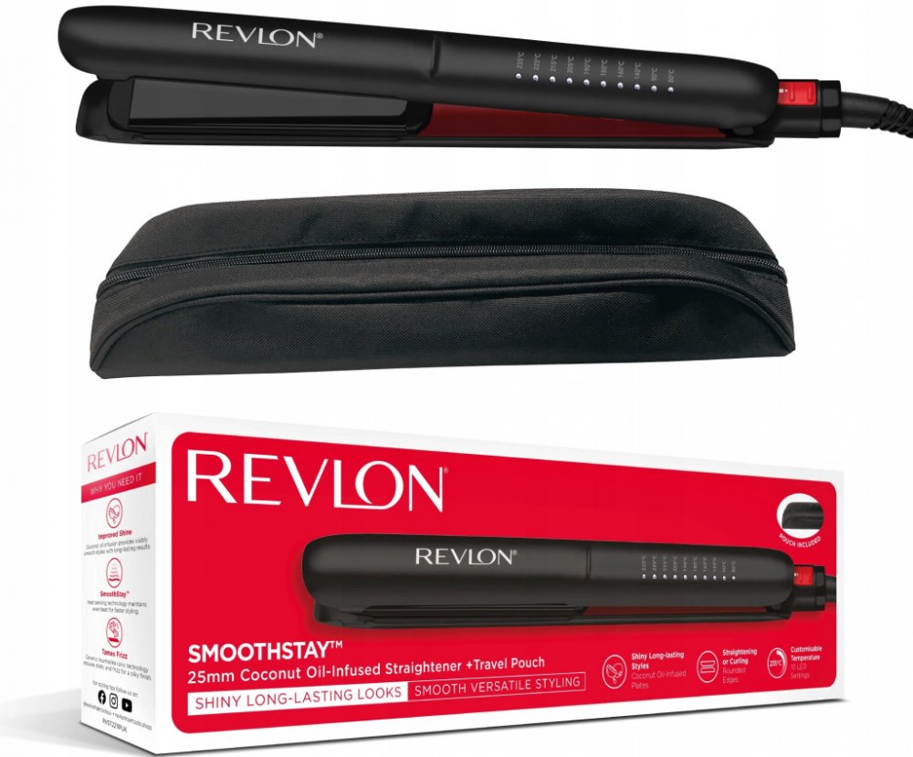 Žehlička na vlasy s technologií s kokosovým olejem. Žehlicí destičky rovnoměrně distribuují teplo po povrchu a chrání tak vlasy před poškozením. Generátor záporných iontů eliminuje statickou elektřinu a díky tomu budou vaše vlasy lesklé a hladké. O rychlý styling se postará technologie Smoothstay Heat Sensing, která zaručí rovnoměrnou distribuci tepla po celé ploše. Díky zaobleným hranám mají dest...