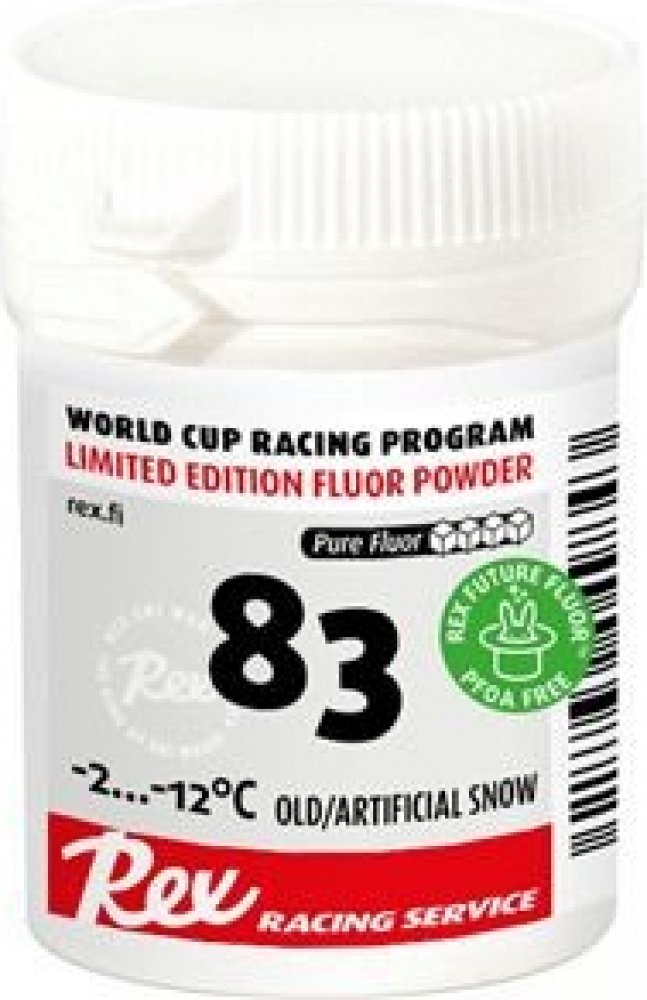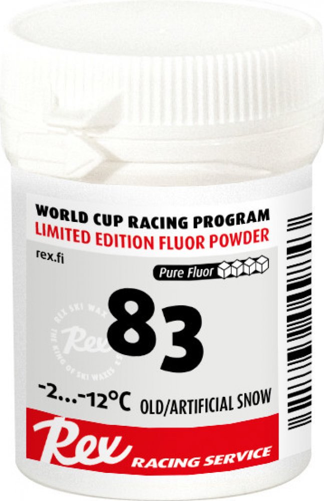 Rex "83" je sourozenec "77", je nejlepší, když se nový sníh začne přeměňovat na starší sníh. Výsledek intenzivního práškového výzkumu a vývoje před mistrovstvím světa v Lahti 2017, kde dominoval během chladných dnů her. Obsahuje grafit.