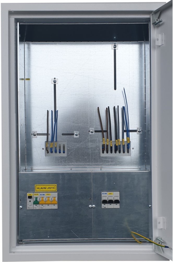 - Elektroměrový rozvaděč pro 1 měření, 1 relé pro spínání sazby NT a HDO pro ovládání FVE