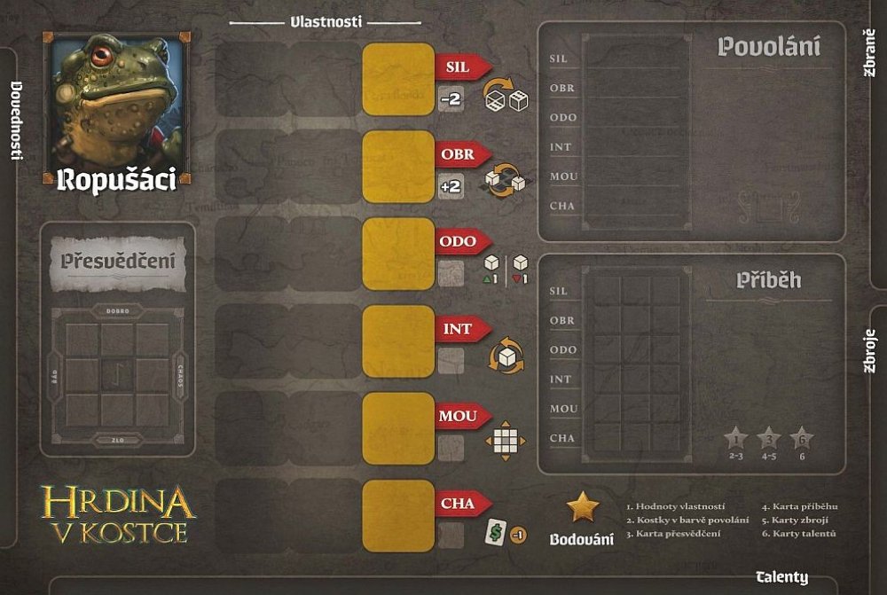 Na začátku si vylosujete rasu, povolání, přesvědčení a původ a v průběhu hry se snažíte pomocí správného umisťování kostek získat ty správné statistiky, jako je síla, obratnost, charisma apod. Čím silnější kostku ale vyberete, tím později budete v daném kole vybírat z karet vybavení, dovedností a vlastností, které umí také slušně nabrat body. Navíc po umístění kostky k dané vlastnosti můžete prové...