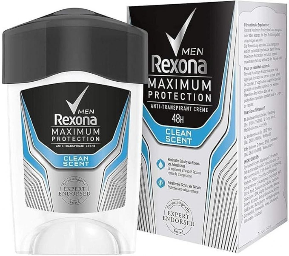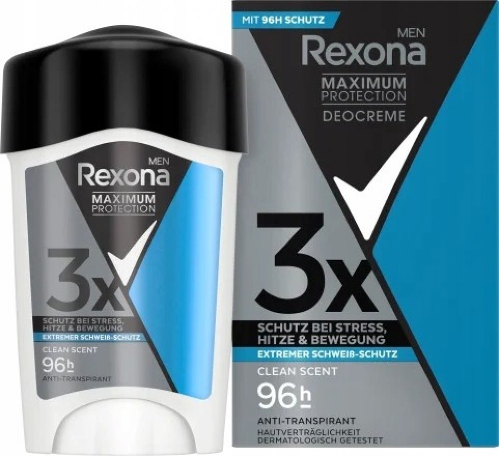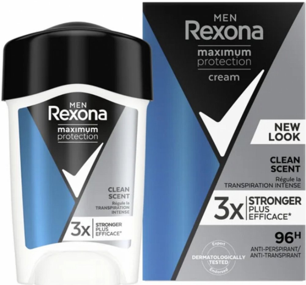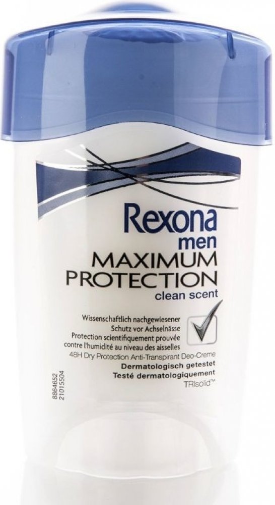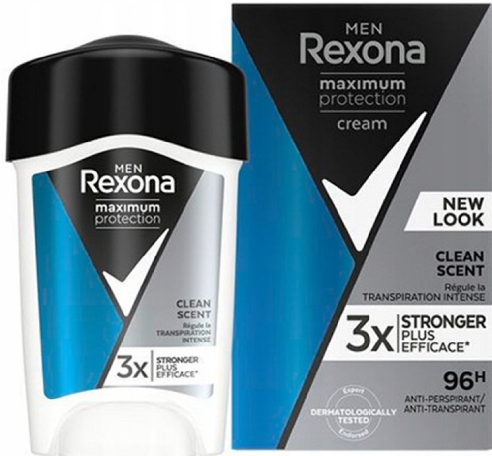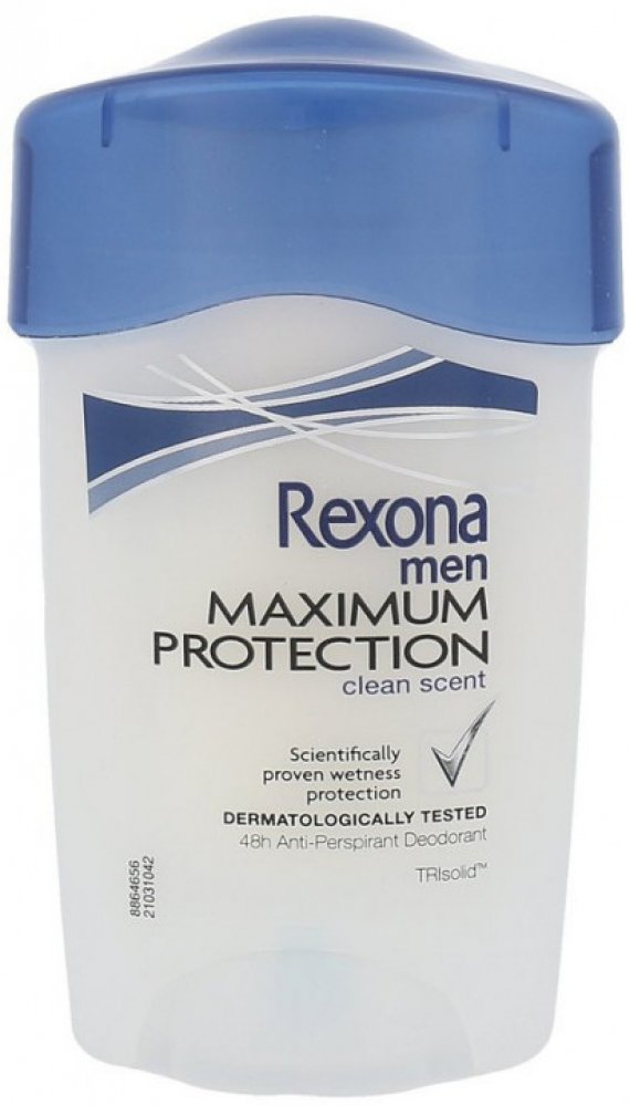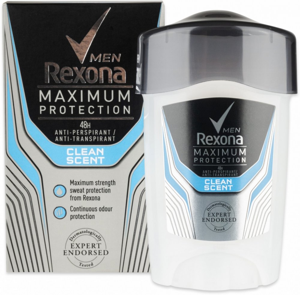 Rexona Maximum Protection pro muže Vám poskytne dvakrát účinnější ochranu proti pocení v porovnání s běžným antiperspirantem ve spreji. Vylepšené složení s inovativní technologií TRIsolid reagující na pohyby těla poskytuje: vědecky ověřenou ochranu proti pocení, technologii proti zápachu, vysoce účinnou složku pro hydrataci pokožky. Rexona Men Maximum Protection je dermatologicky testovaný antiperspirační krém s technologií TRIsolid a s vědecky ověřenou 48hodinovou ochranou proti pocení.