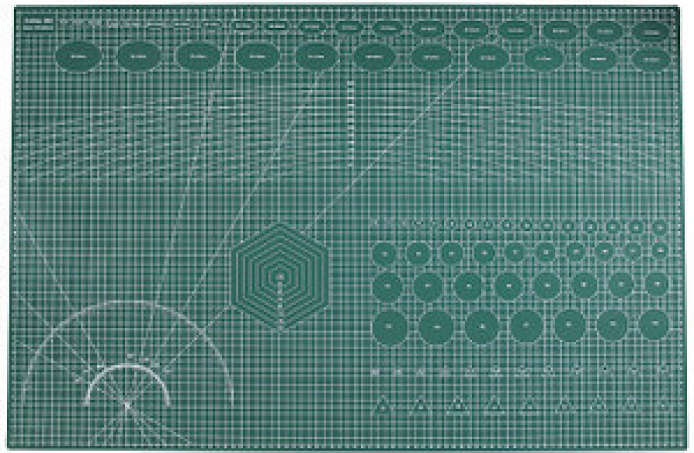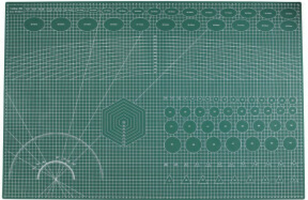 Řezací podložka zelená 90x60cm Profesionální řezací podložka pro komfortní a přesné řezání papíru, kartonu, apod. Je složená z mnoha vrstev, což zaručuje její odolnost a zacelení v místech v řezu. Na podložce jsou vykresleny milimetrové přímky a různé tvary. Rozměr 60x90cm Šířka cca 3mm Vícevrstvé složení