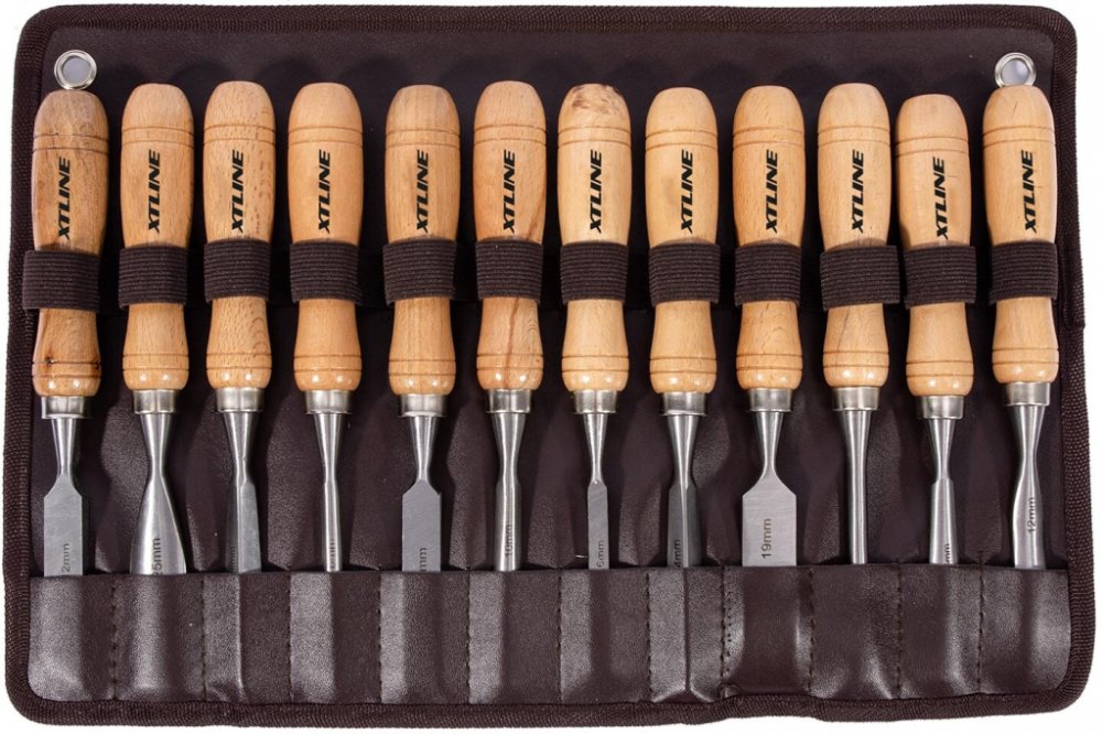 Sada řezbářských dlát pro začátečníky v látkovém obalu. Dláto V: 10, 12 mm Dláto půlkulaté: 6, 10, 16, 25 mm Dláto ploché: 8, 12 mm Dláto zkosené: 17 mm Dláto ploché prohnuté: 12 mm Dláto půlkulaté prohnuté: 12 mm Dláto lopatkové: 18 mm Materiál: 60Crv