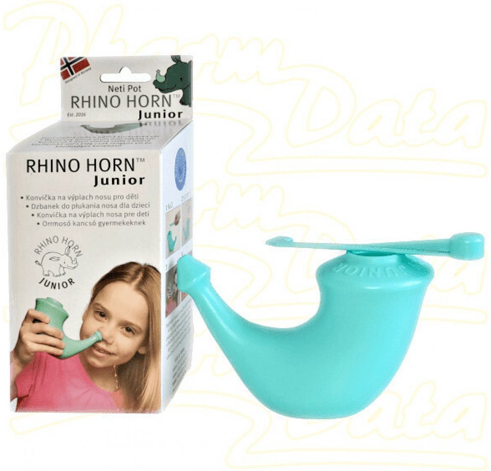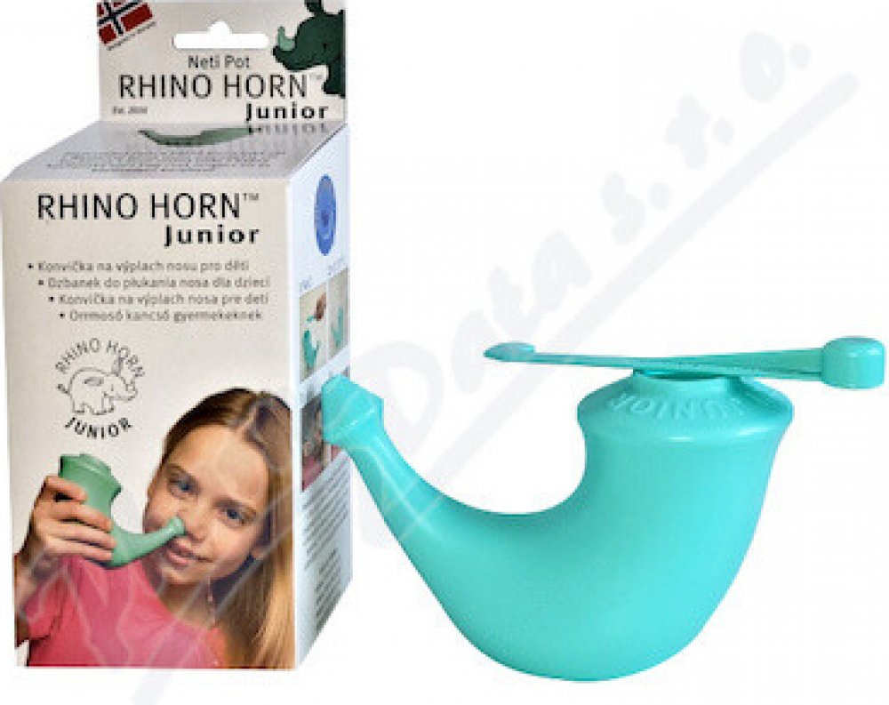 Konvička Rhino Horn™ Junior je speciálně navržená pro děti ve věku 4 až 12 let. Oproti originální konvičce Rhino Horn™ je její objem asi o 1/3 menší, tj. cca 200 ml, a je tedy vhodnější pro dětskou ruku. Menší je i ústí nálevky, které se tak lépe hodí pro menší dětský nos.