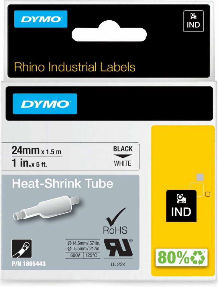 Průmyslové teplem smrštitelné etikety DYMO jsou vyrobeny z průmyslového polyolefinu a mají poměr smrštění 3:1, což umožňuje pohodlný tisk přímo na samotnou trubku pomocí jakéhokoli průmyslového etiketovacího nástroje DYMO pro vynikající identifikaci kabelů. Tyto samolepky mají snadno odlepitelnou zadní stranu, díky které je jejich aplikace snadná. Kompatibilní s průmyslovými tiskárnami štítků DYMO Rhino 4200, 5200, 6000.
