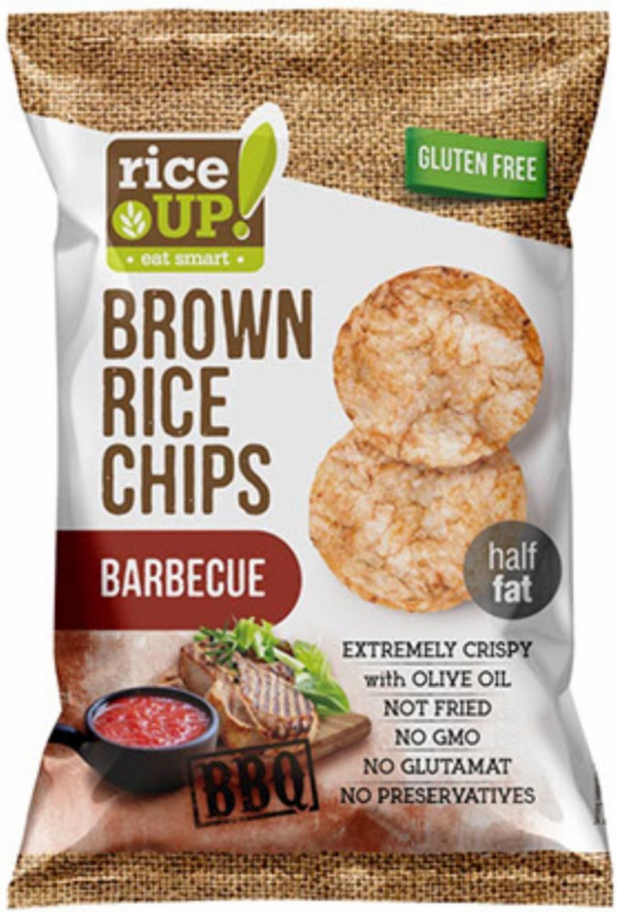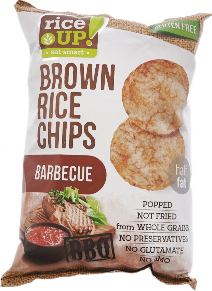 Rýžové chipsy s příchutí barbecue – bez lepku, bez konzervantů, s vysokým obsahem vlákniny. Skvělá alternativa smažených bramborových chipsů apod.