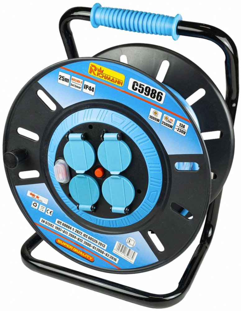 Prodlužovací kabel na bubnu je ideální pro použití v exteriéru i interiéru díky ochraně podle normy IP44. Vybaven čtyřmi zásuvkami s krytkami a uzemněním. Při plném rozvinutí zvládne připojení zařízení o výkonu až 2500W, při navinutí pak 1000W. Má integrovanou pojistku proti přepětí (13 A). Odolný plastový buben a kovový rám zaručují dlouhou životnost i při častém používání.