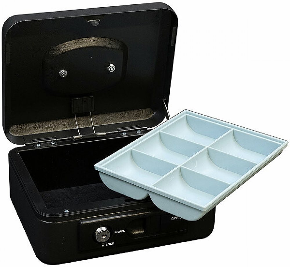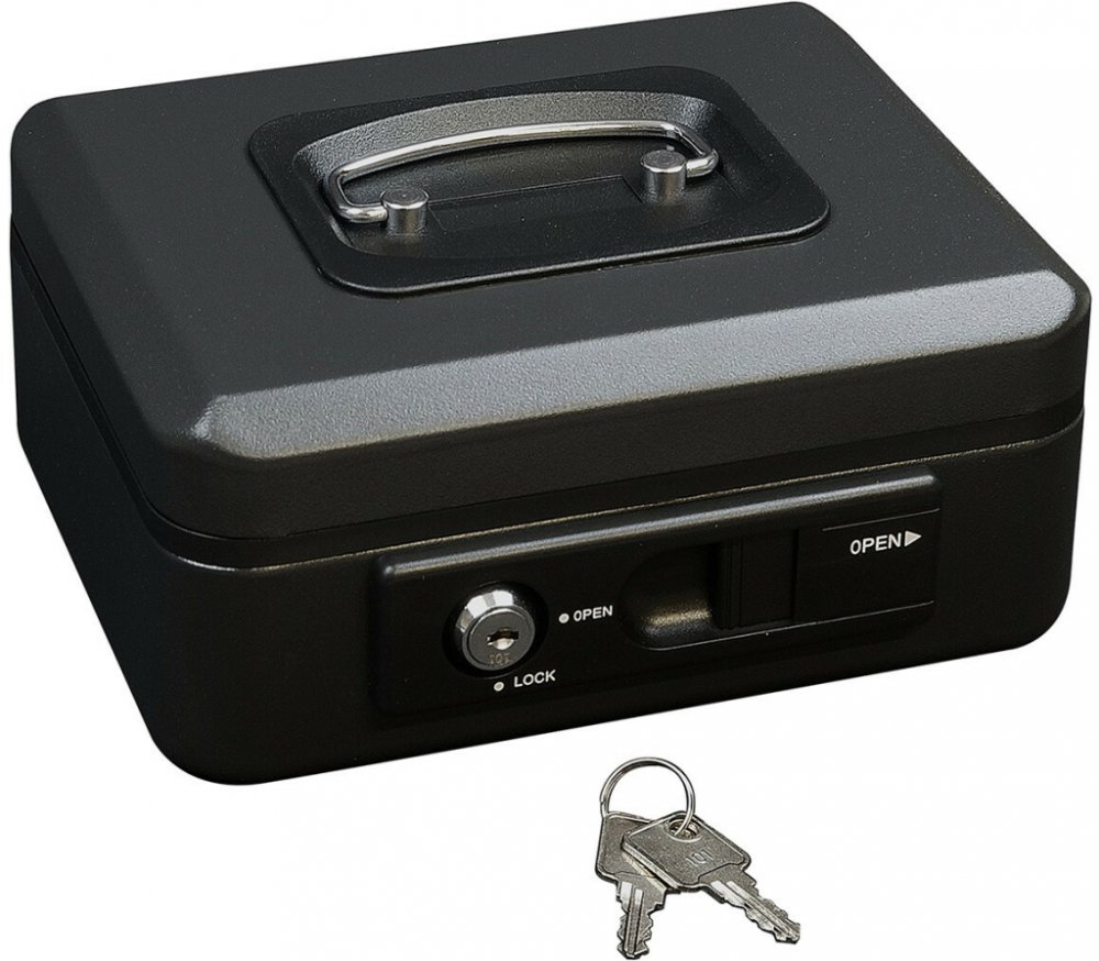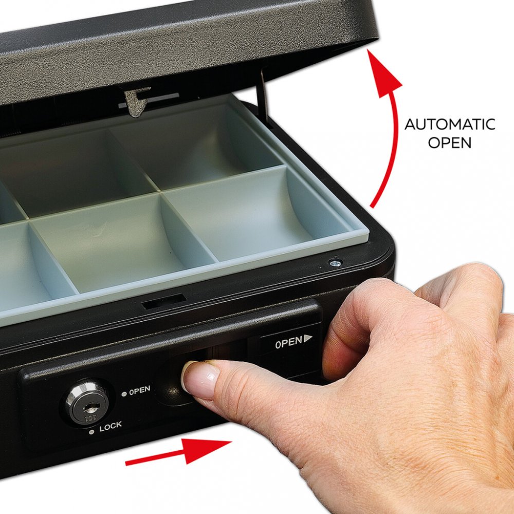 Pokladnička z oceli je vybavena vnější páčkou pro pohodlné automatické otevření víka. Po uzavření se víko automaticky aretuje, což umožňuje bezpečné přenášení, bez nutnosti uzamčení klíčem.