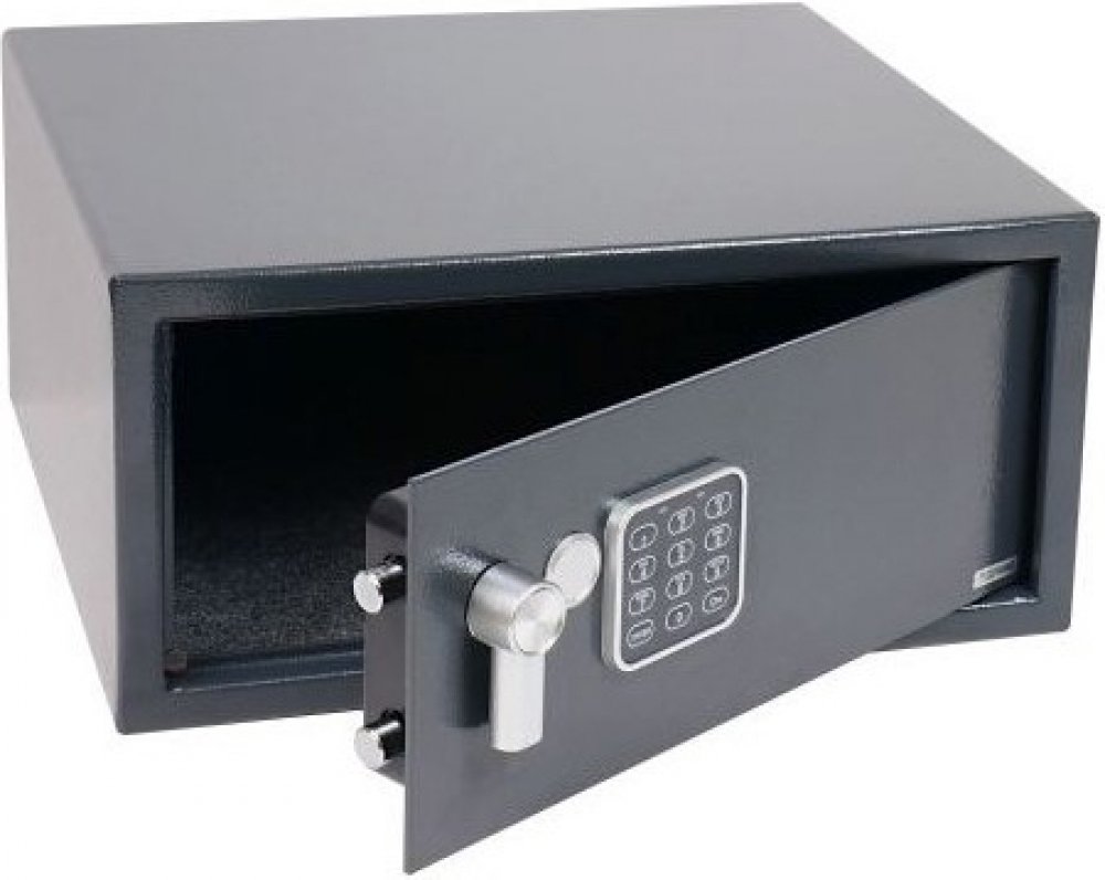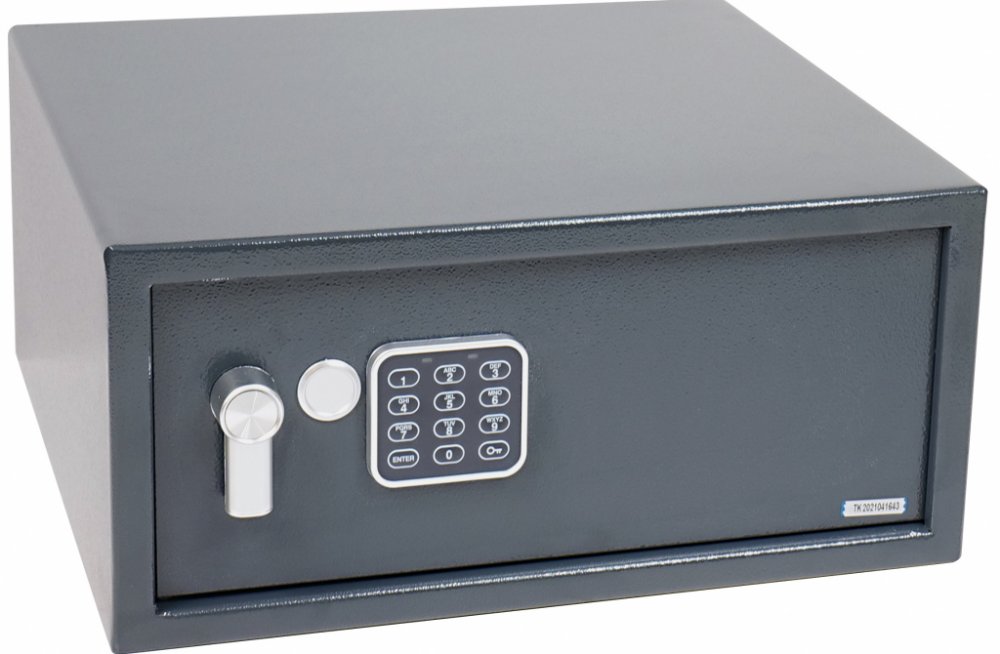 - Ocelový sejf s elektronickým zámkem, číselnou klávesnicí a páčkou na otevření.