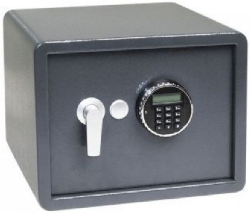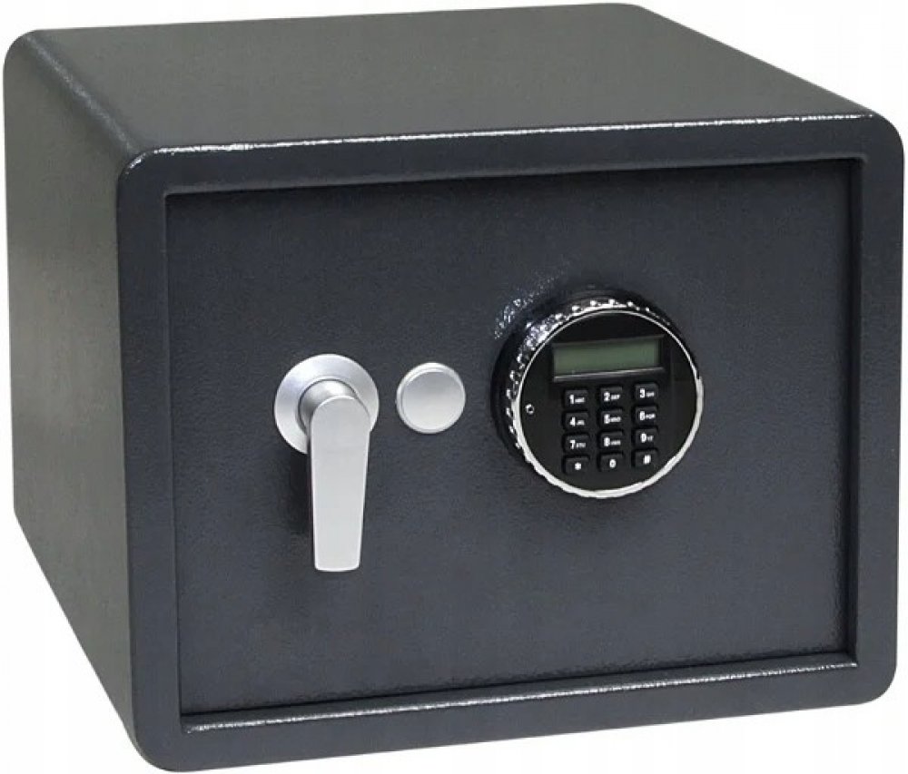 Ocelový sejf s elektronickým zámkem s alarmem, podsvíceným LCD displejem a páčkou k otevření.