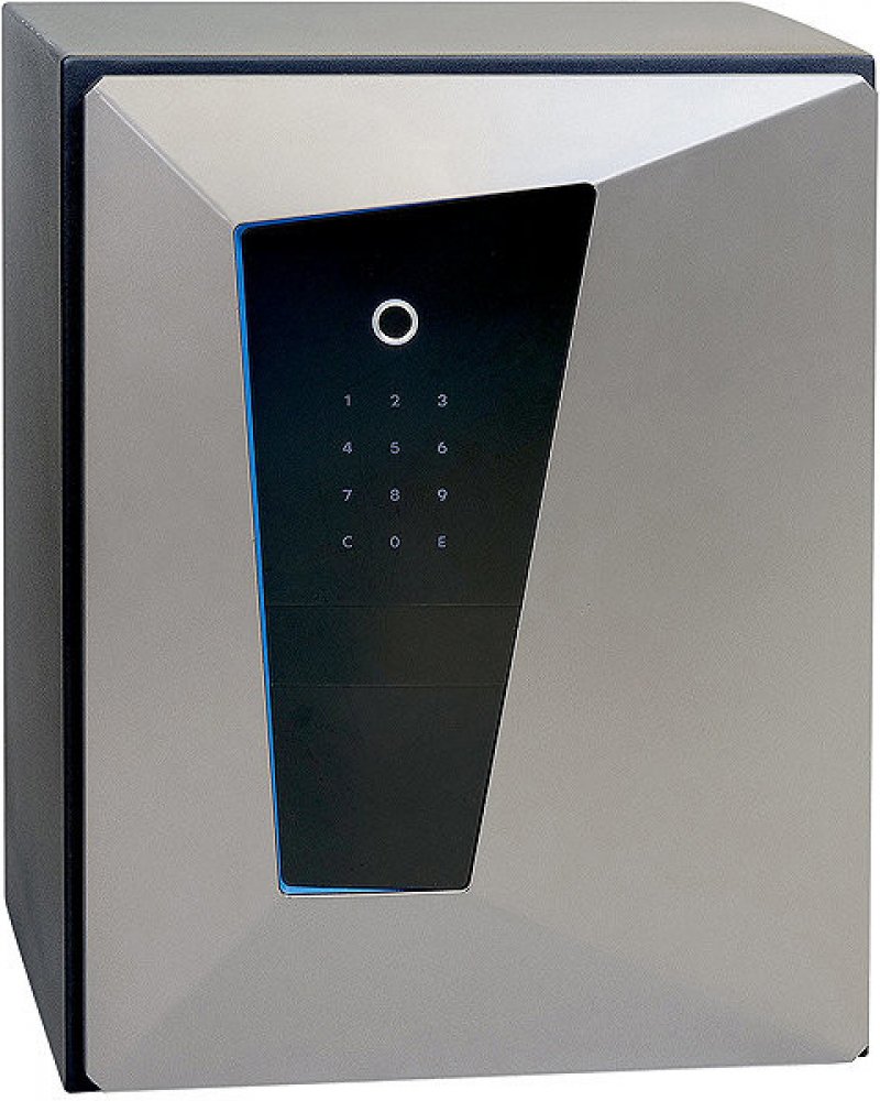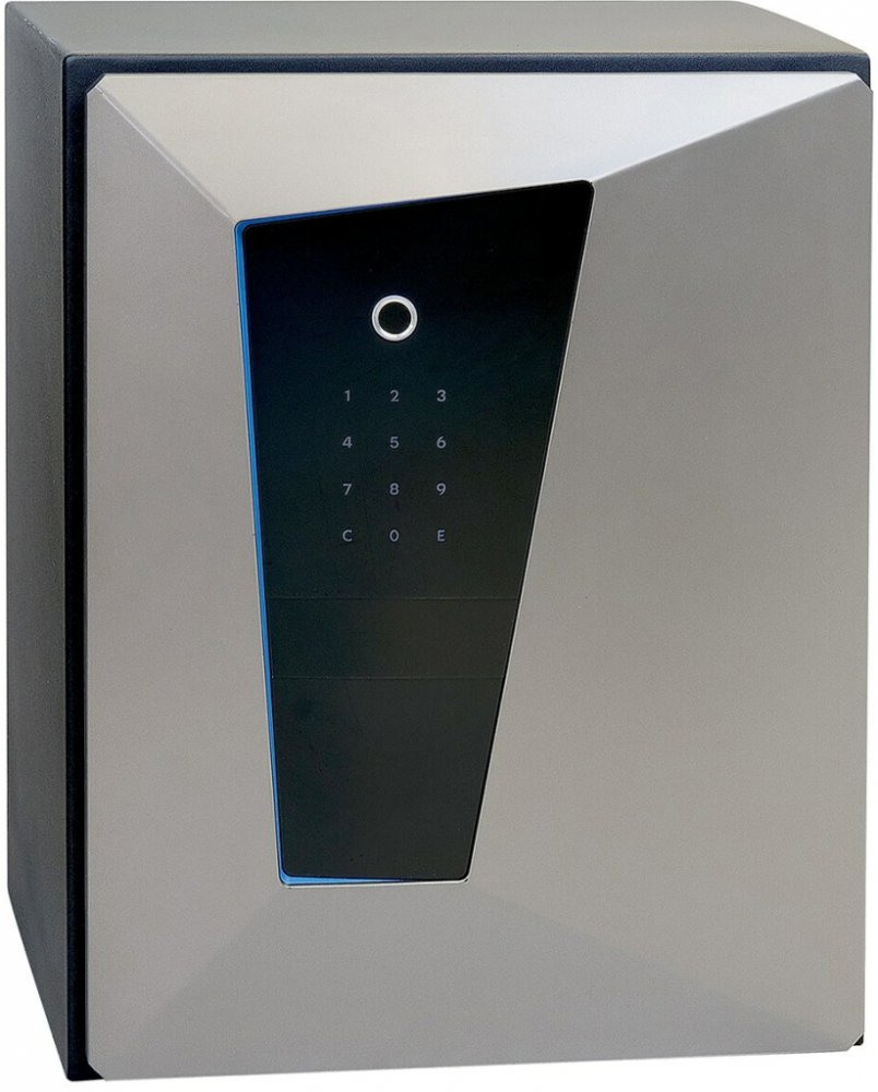 Ocelový sejf v protipožárním provedení s elektronickým zámkem na otisk prstu a číselným kódem.