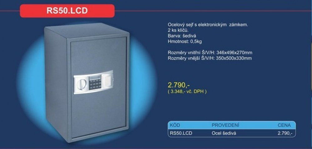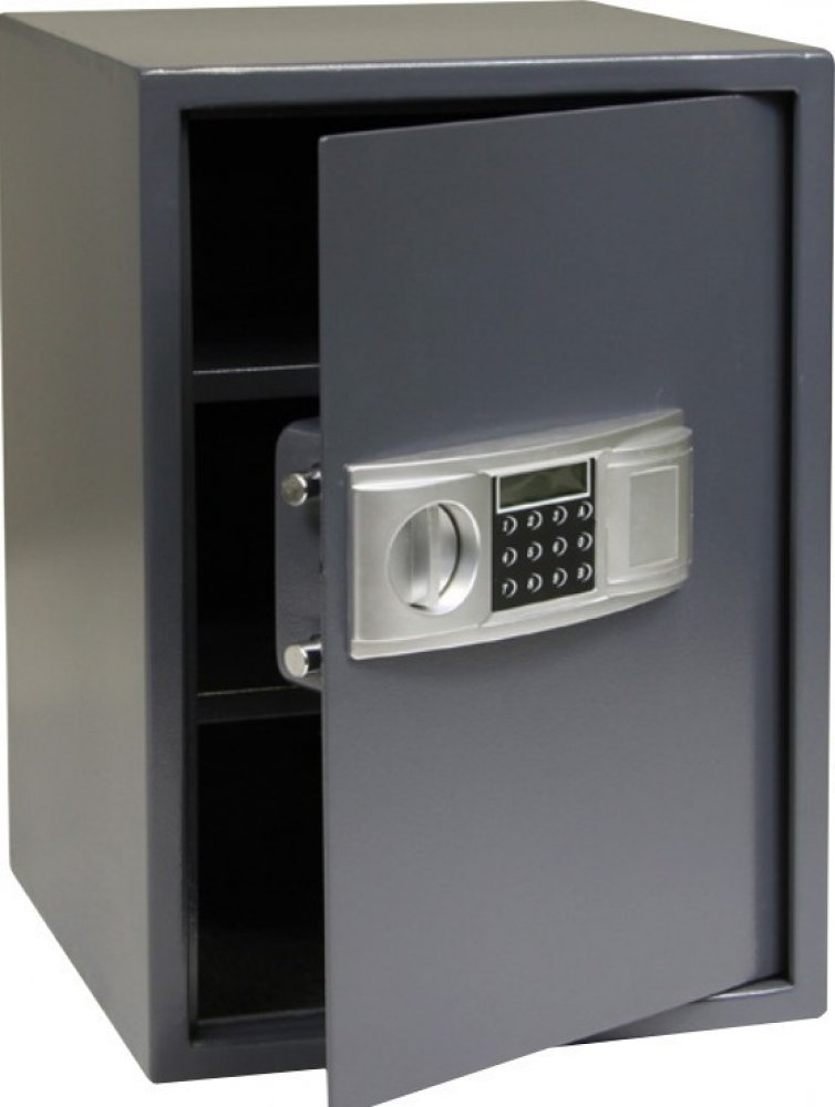 Nábytkový trezor s elektronickým zámkem a LCD displejem. Velmi dobře čitelné zobrazení na displeji. Ukazatel slabých baterií. Tloušťka stěny 4 mm (dveřní plát) a 2 mm (korpus). Možnost nouzového otevření klíčem. Možnost ukotvení ke stěně nebo podlaze. Vnitřní prostor můžete policemi rozdělit přibližně na třetiny (platí pouze pro 1123057). Police nejsou výškově stavitelné, ale vyjmutelné.