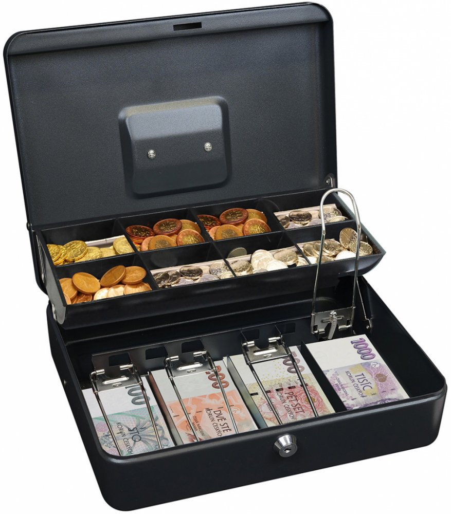 Tato pokladnička je vyrobena z odolného materiálu, který zajišťuje její robustnost a dlouhou životnost. Její hlavní předností je integrovaná, pevně fixovaná přihrádka na mince rozdělená přesně podle nominálních hodnot českých korun (CZK).