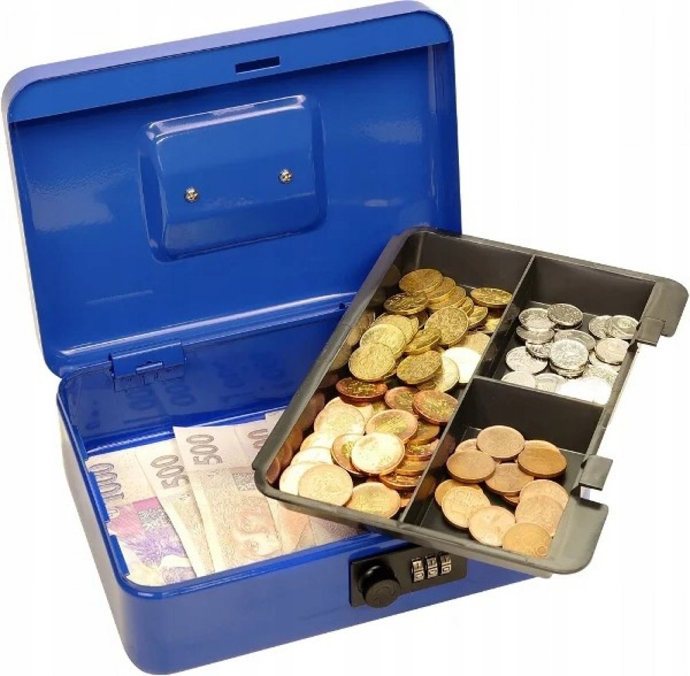 Příruční pokladna TS 3010 Příruční ocelová pokladna je praktickým způsob, jak uchovávat peníze. Pokladna obsahuje vyjímatelnou plastovou vanu na mince. Pod vanou můžete následně schovávat papírovou hotovost. Pokladna disponuje kódovým zámkem, který má až 1 000 kombinací. Kód k otevření můžete kdykoliv změnit a vytvořit si tak vlastní.