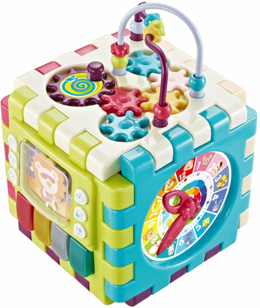 Kostka obsahuje mnoho pohyblivých prvků: různé ozubené převody, počítadla, hodiny, třídičku tvarů, otevírací dvířka i chrastítko. Součástí setu je také hudební panel napájený 3 × AAA bateriemi (nejsou součástí balení). Pro pohodlné používání je k dispozici úplné vypnutí a dvoustupňová regulace hlasitosti. Produkt je vhodný i jako dárek díky barevnému balení a má certifikát EN71.