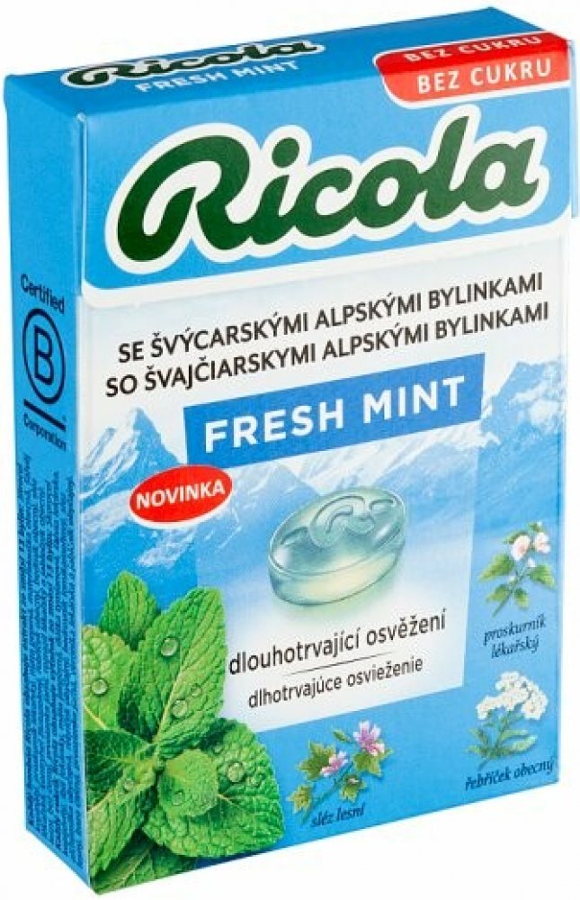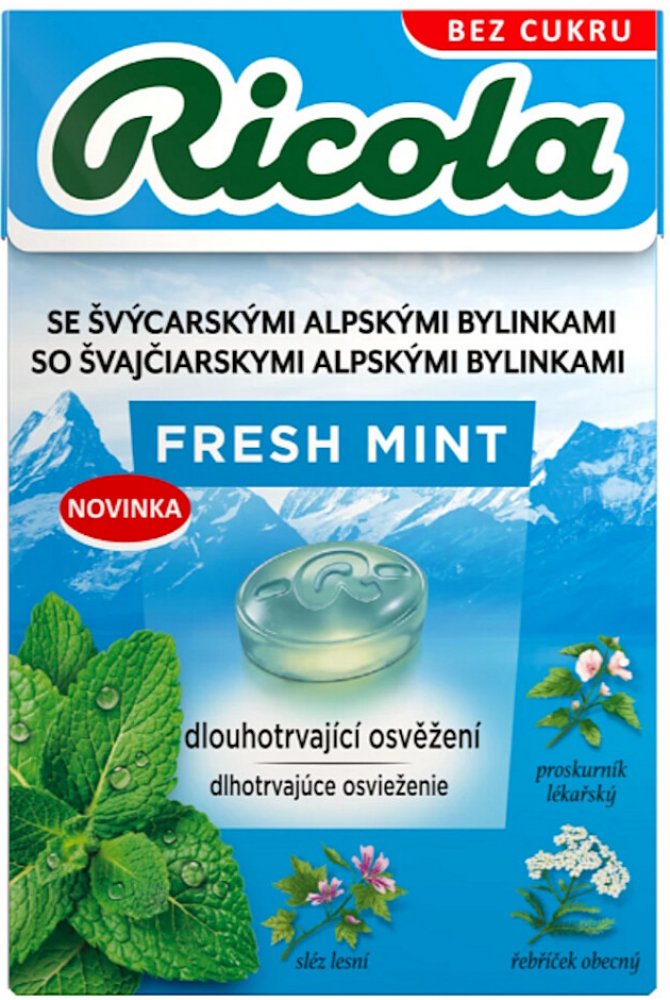 Cucavé bonbony Ricola Fresh Mint bez cukru kombinují 13 švýcarských alpských bylinek pro dlouhotrvající svěžest.Vhodné pro vegany.Dlouhotrvající mátová svěžest.Neobsahuje cukr, lepek ani laktózu.Máta peprná podporuje přirozenou obranyschopnost, relaxaci a spánek.Každý bonbon obsahuje 13 švýcarských bylin, sbíraných bez použití syntetických chemikálií.Balení obsahuje 40 g.