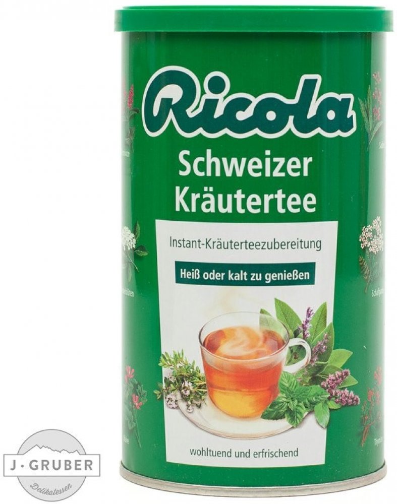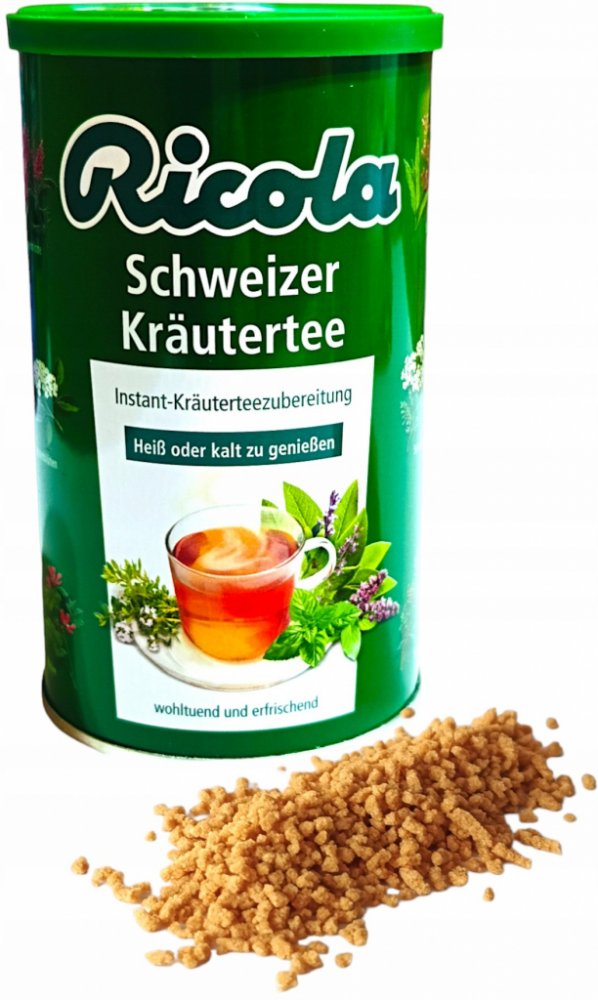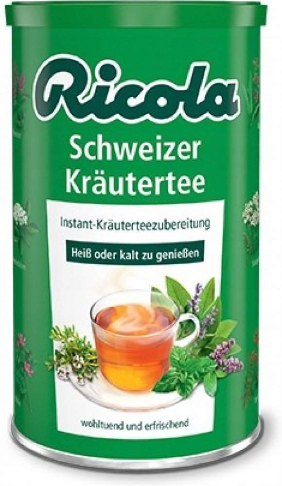 Ricola - švýcarský bylinkový čaj 200 g. Čaj Ricola se zkládá ze 13 vzácných bylin podle světoznámého Ricola původního a stejného receptu. Složení: cukr, dextróza, rostlinný extrakt (2,7%) z jitrocele, ibišek, máta peprná, tymián, šalvěj, kontryhel, řebříček, burnet, sléz, květ černého bezu, petrklíč, rozrazil, jablečník obecný, karmel cukr, přírodní příchuť máty.
