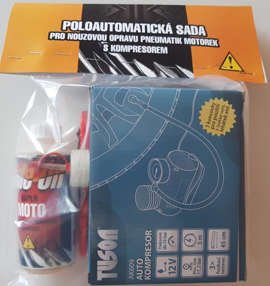 Sada pro nouzovou opravu – zalepení pneumatik motocyklů, s utěsňovacím gelem a husticím kompresorem – Ride-On Vhodné pro použití přímo na cestě: do píchlého kola aplikujete speciální gel a následně pomocí kompresorku pneumatiku nahustíte na předepsaný tlak (přístroj je možno zapojit např. do zapalovače – zásuvky). Opravu lze zvládnout v 1 osobě. Gel Ride-On obsahuje částečky kevlaru, který je 6x p...