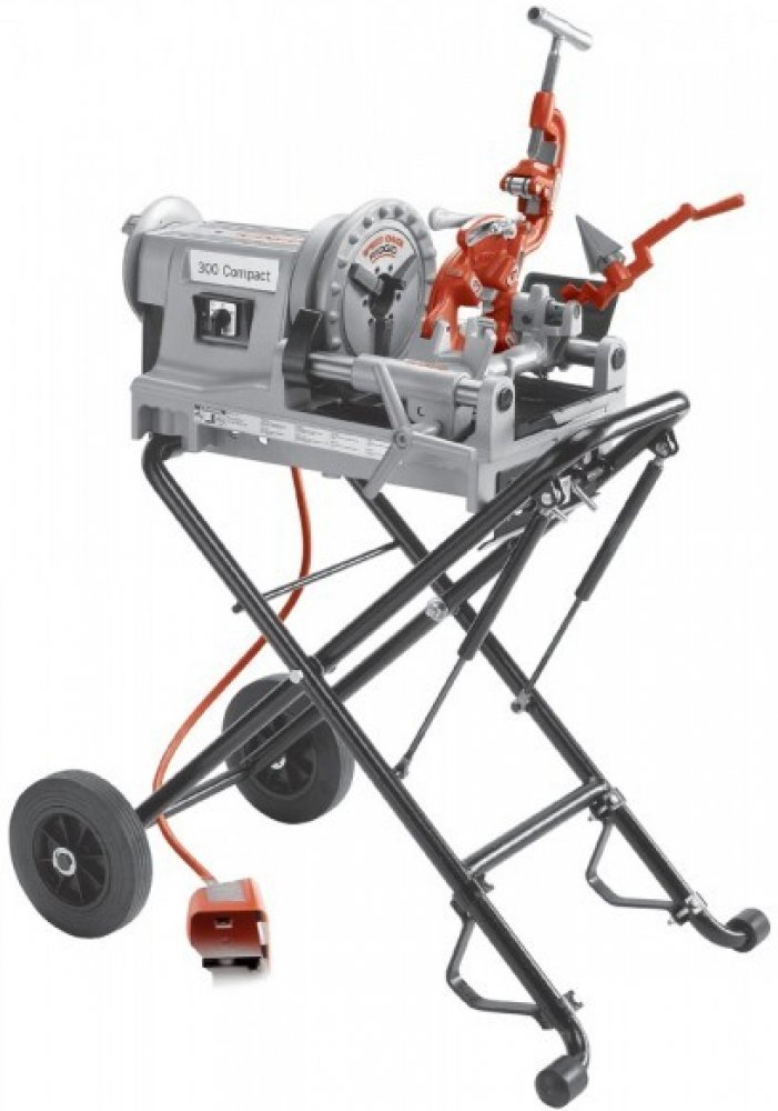 RIDGID Model 300 Compact elektrický závitořez Vlastnosti Motor: univerzální 1,7 kW, 25 - 60 Hz. Spínač: přepínač "vpřed / vypnuto / zpět", bezpečnostní nožní spínač. Otáčky: 38 ot / min. Upínací čelní sklíčidlo: kladivový-rázový mechanismus s výměnnými čelisťovými vložkami. Zadní středicí sklíčidlo: rázový mechanizmus. Olejový systém: olej rozváděn zubovým čerpadlem z olejové vany závitořeznou hla...