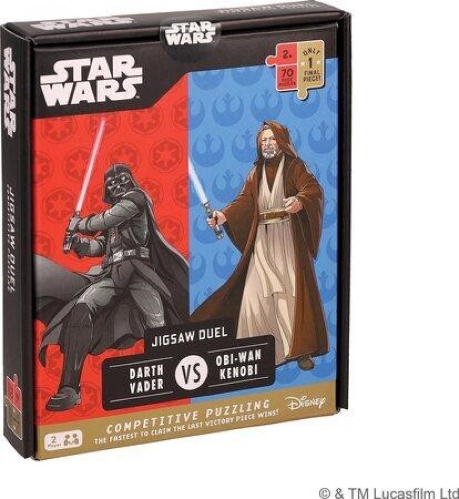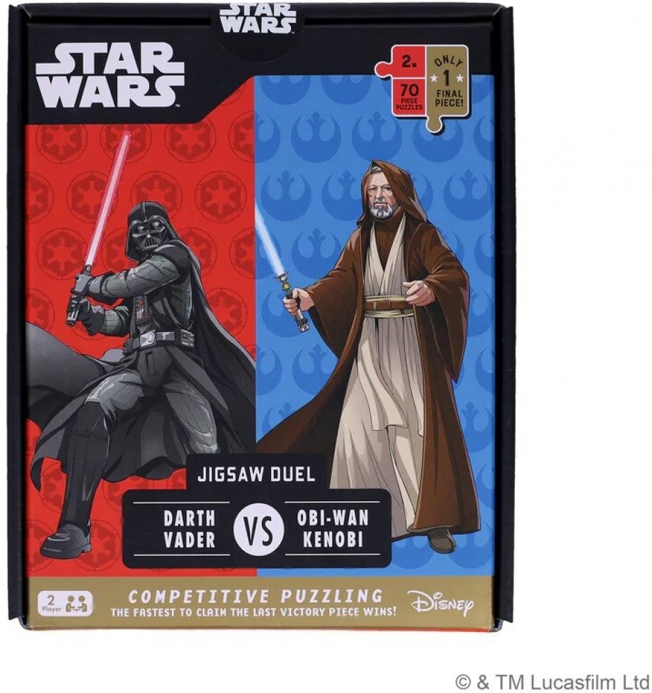 Kdo získá vítězství v duelu, Obi-Wan, nebo Darth Vader?! V této inovativní kompetitivní hře budete zároveň se svým protihráčem skládat 70dílné puzzle, ale pozor! Poslední dílek je jen jeden, oboustranný, který pasuje do obou puzzle. Ten vložte do dřevěného stojánku. Vyberte si svou stranu Síly a připravte se na duel! Hráč, který dokončí své puzzle jako první, může sáhnout po posledním oboustranném...