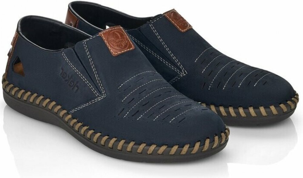 Univerzální, nadčasové nazouvací mokasíny. Vrchní materiál je hladká kůže. Vnitřek obuvi je syntetický. Nášlapná stélka je vyměkčená, syntetická a vyjímatelná. Barva u tohoto vzoru je modrá. Podešev je flexibilní, syntetická. Výška podpatku je cca 2,8 cm. Obuv je v šíři H.