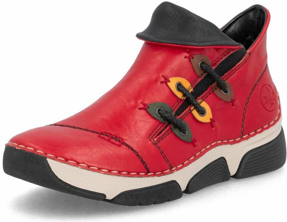 Tato kotníková obuv od značky Rieker zaujme na první pohled svým nápaditým designem a důrazem na pohodlí. Svršek červené barvy doplňuje kontrastní prošívání, různobarevné detaily a logo značky, které dodávají botám módní a originální nádech. Nárazy tlumící podešev ve spojení s měkkou stélkou se postará o komfort během celého dne a díky praktickému střihu bez zapínání je obutí rychlé a snadné. Ideá...
