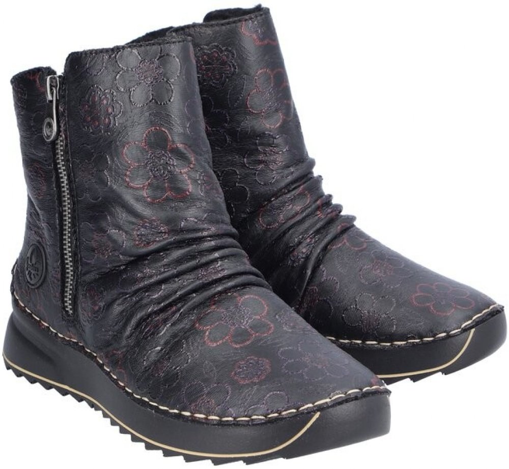 Pokud hledáte boty, které spojují pohodlí, kvalitu, a jsou vhodné pro různé příležitosti, tak tento model od značky Rieker bude jasnou volbou. Černý svršek kotníkových bot je po celé ploše zdobený květinami v kombinaci červené a černé barvy. Boty jsou kontrastně prošité světlou nití a zdobené logem značky. Pomocí zipů po obou stranách bot si je jednoduše a rychle nazujete. Díky měkké stélce a hřej...