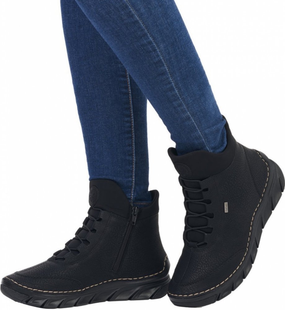 Dámská kotníková obuv v černé barvě značky Rieker. Snadné obutí díky zipu na vnitřní straně obuvi a pružnému lemu horního okraje. Měkká stélka zajistí pohodlí na každém kroku.