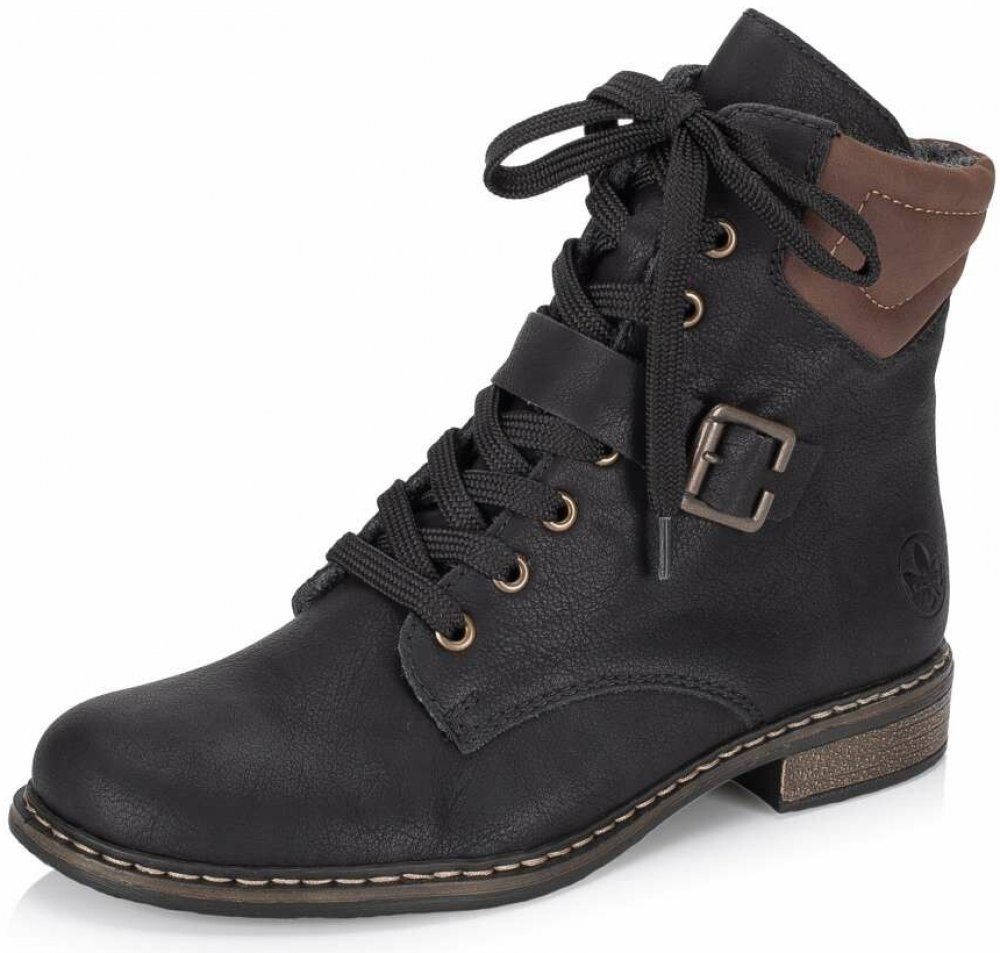Tyto stylové kotníkové boty značky Rieker představují ideální spojení praktičnosti a módního designu. Černý svršek vytváří univerzální vzhled, díky kterému je snadno sladíte s každodenním outfitem, výrazným dekoračním prvkem je pásek přes nárt se sponou a dalším působivým prvkem je hnědý lem horního okraje, který svojí barvou vytváří módní kontrast. Neodmyslitelné logo značky je umístěno v části p...