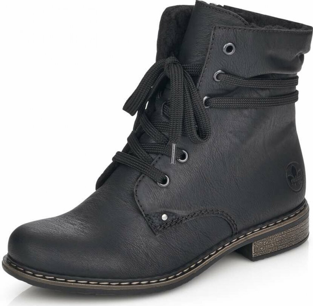 Jednoduchá krása této kotníkové obuvi značky RIEKER Vás zaručeně upoutá. Hladký černý svršek je zdobný tkaničkou kolem kotníku, jemným prošíváním a vytlačeným logem značky. Šněrování a zip na vnitřní straně Vám poslouží pro snadnější nazutí. Podešev z kvalitního syntetického materiálu s technologií Antistress je ozdobena prošíváním. Tento model krásně zdůrazní každý Váš outfit na procházkách měste...
