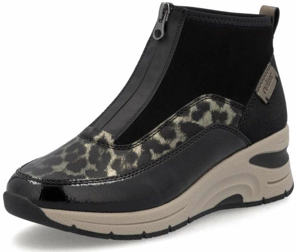 Vysoce módní boty RIEKER zaujmou na první pohled díky stylové kombinaci materiálů a dekorativnímu zvířecímu vzoru, který jim dodává výjimečný charakter. Praktický zip umístěný na nártu usnadňuje obouvání, zatímco měkká vyjímatelná stélka se přizpůsobí tvaru vašeho chodidla a zajistí celodenní pohodlí. Nejen dokonalý design má vyšší podešev zvýrazňující celkový vzhled, ale zároveň poskytuje stabili...