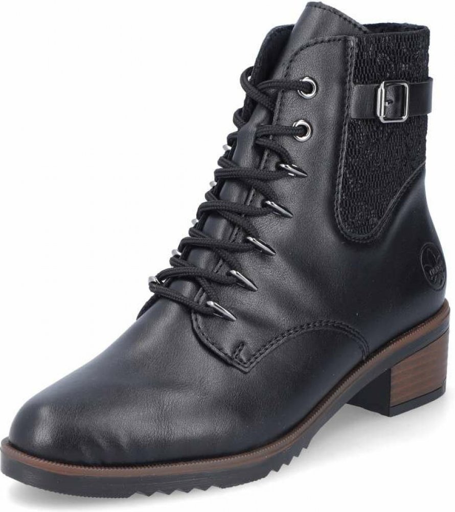 Kotníkové šněrovací boty značky RIEKER s nápaditým lemem horního okraje a dekorační sponou budou krásným doplňkem Vašeho vzhledu. Vrchní materiál je v nadčasovém černém odstínu a snadno boty zkombinujete se svým oblečením. Zip z vnitřní strany usnadní nazutí a šněrováním si obuv upravíte přímo k Vaší noze. Pohodlí při nošení zajistí podešev absorbující nárazy při chůzi a nízký podpatek dodá nádech...