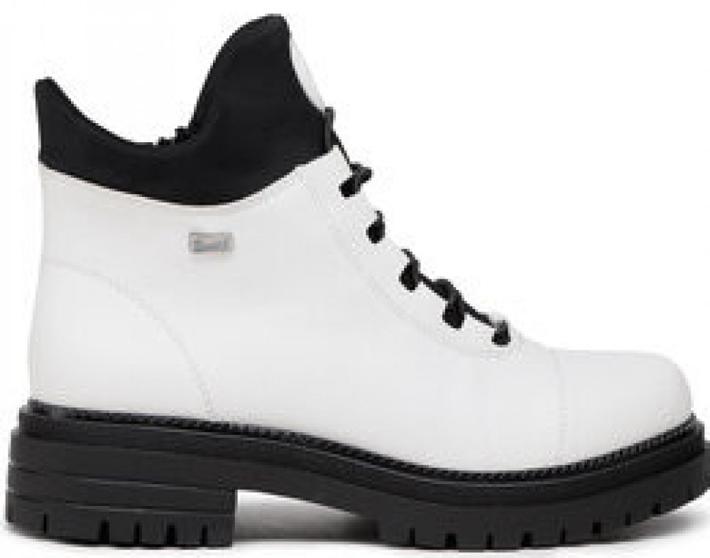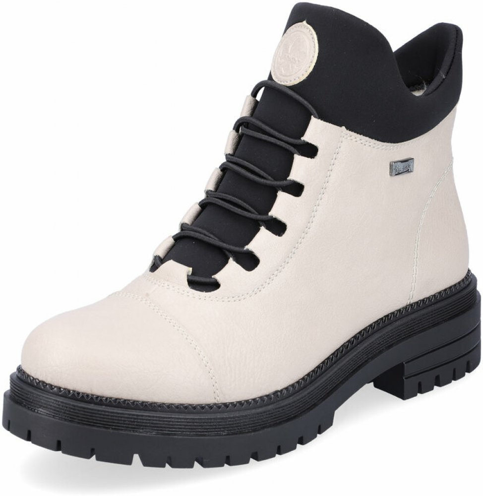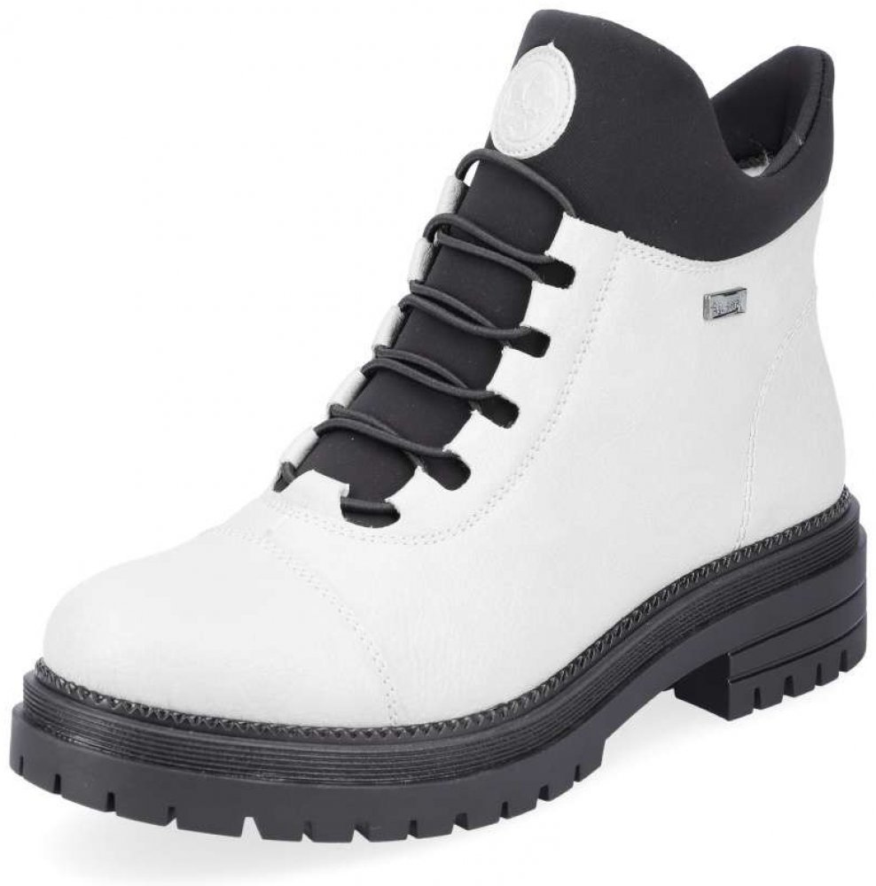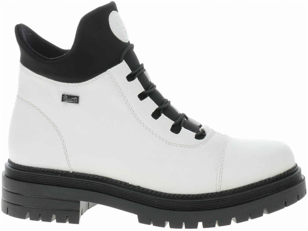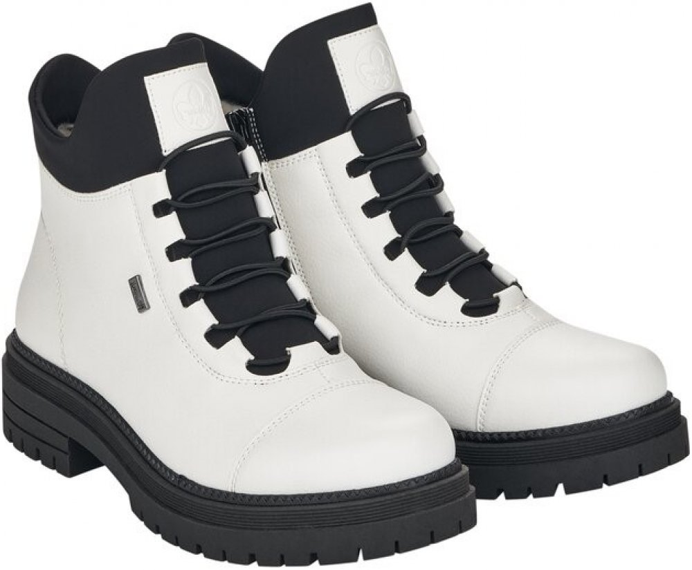 Kotníčková obuv RIEKER z dezénové syntetické kůže v bílé barvě v kombinaci s elastickým textilním materiálem v barvě černé. Obuv je vyteplena textilním kožíškem a vlepenou vyměkčenou filcovou stélkou. Zapínání obuvi je na zip z vnitřní strany. Obuv je vybavena membránou RIEKER TEX a je výrobcem deklarována jako „obuv do každého počasí“ – voděodolnost, výborná ochrana proti chladu, při současném za...