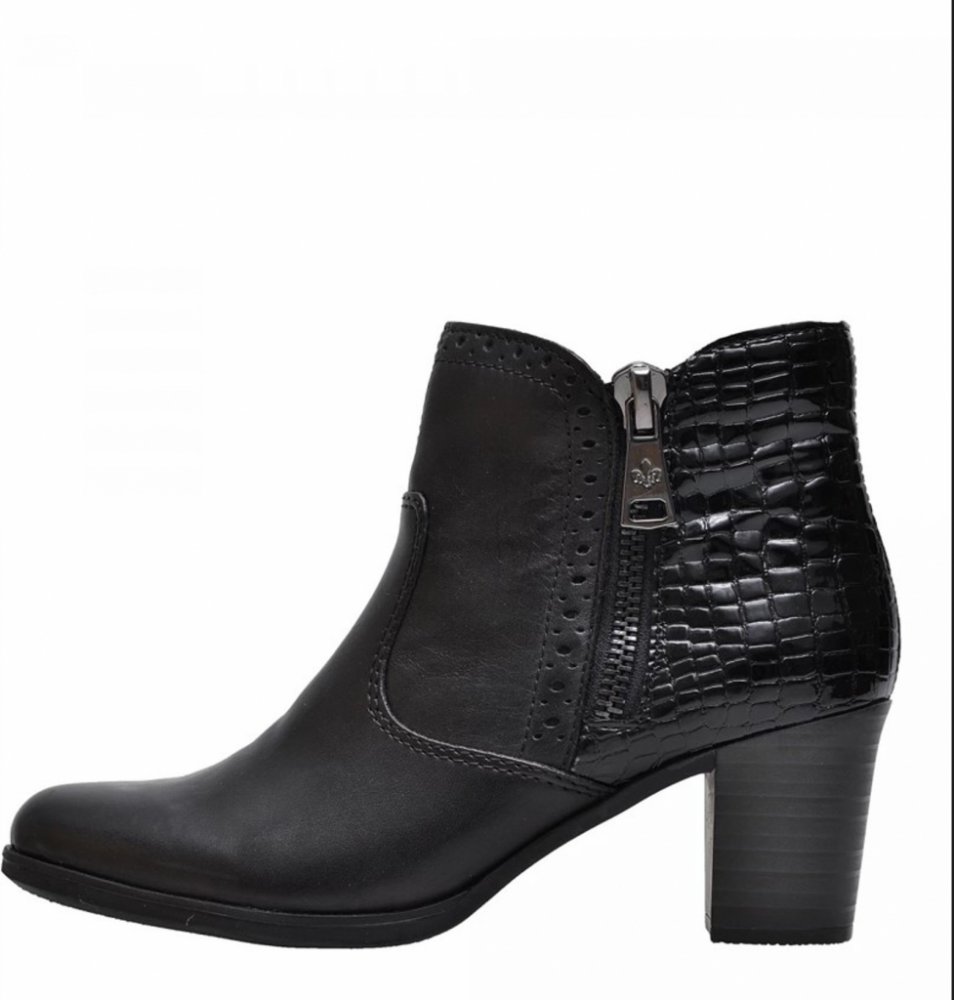 Dámská kotníková obuv v kombinaci kůže a syntetiky, zateplená textilním kožíškem, stélka je filcová. Snadné nazouvání zajišťuje funkční zip na vnitřní straně obuvi.