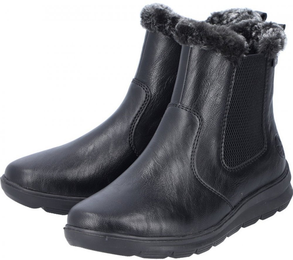 Dámská zateplená kotníková obuv, vyrobená z kvalitní syntetiky. Vnitřek obuvi tvoří podšívka s kratším chlupem a vyjímatelná komfortní textilní stélka. Obuv je vybavena Rieker-TEX membránou. Snadné nazouvání zajišťuje elastická vsadka na vnější straně a zip na vnitřní straně obuvi.