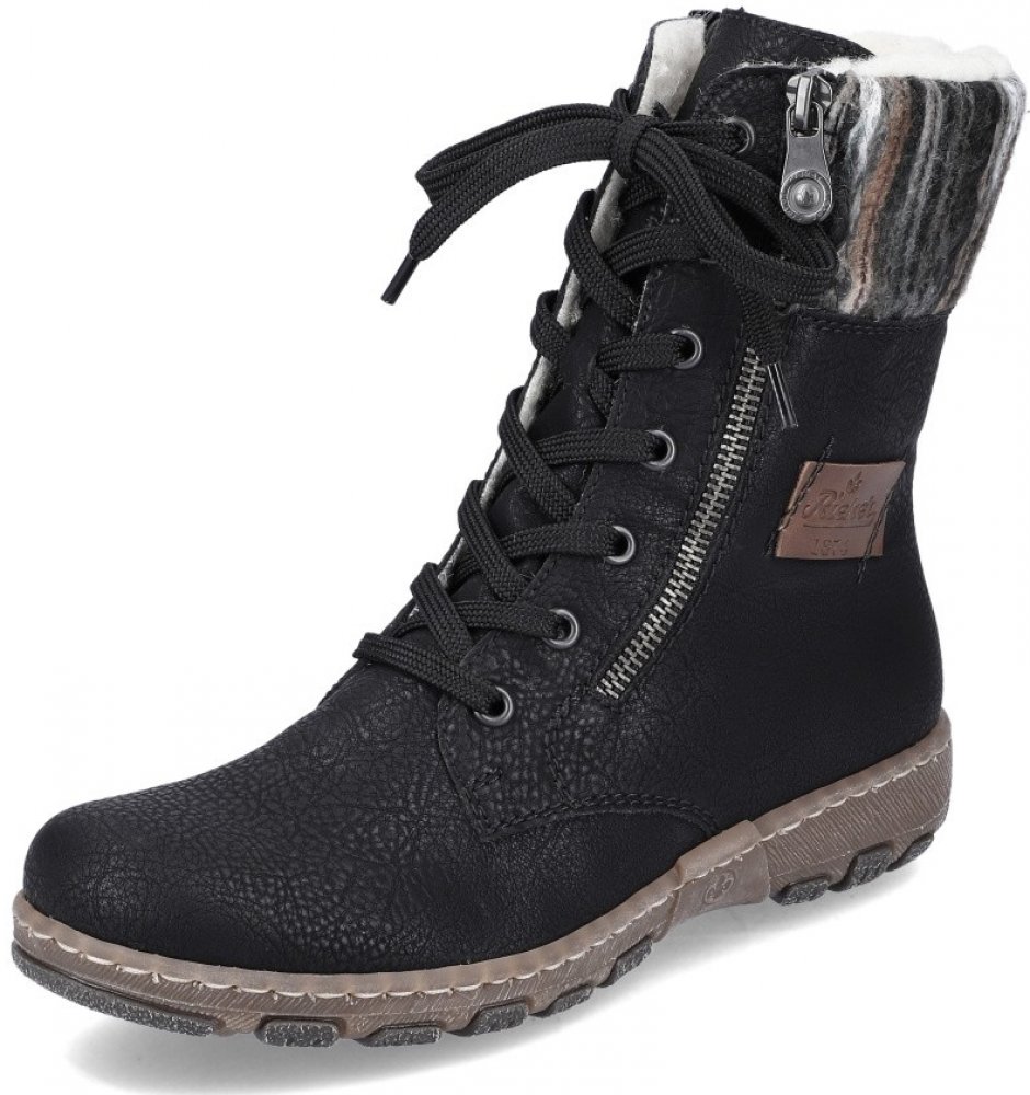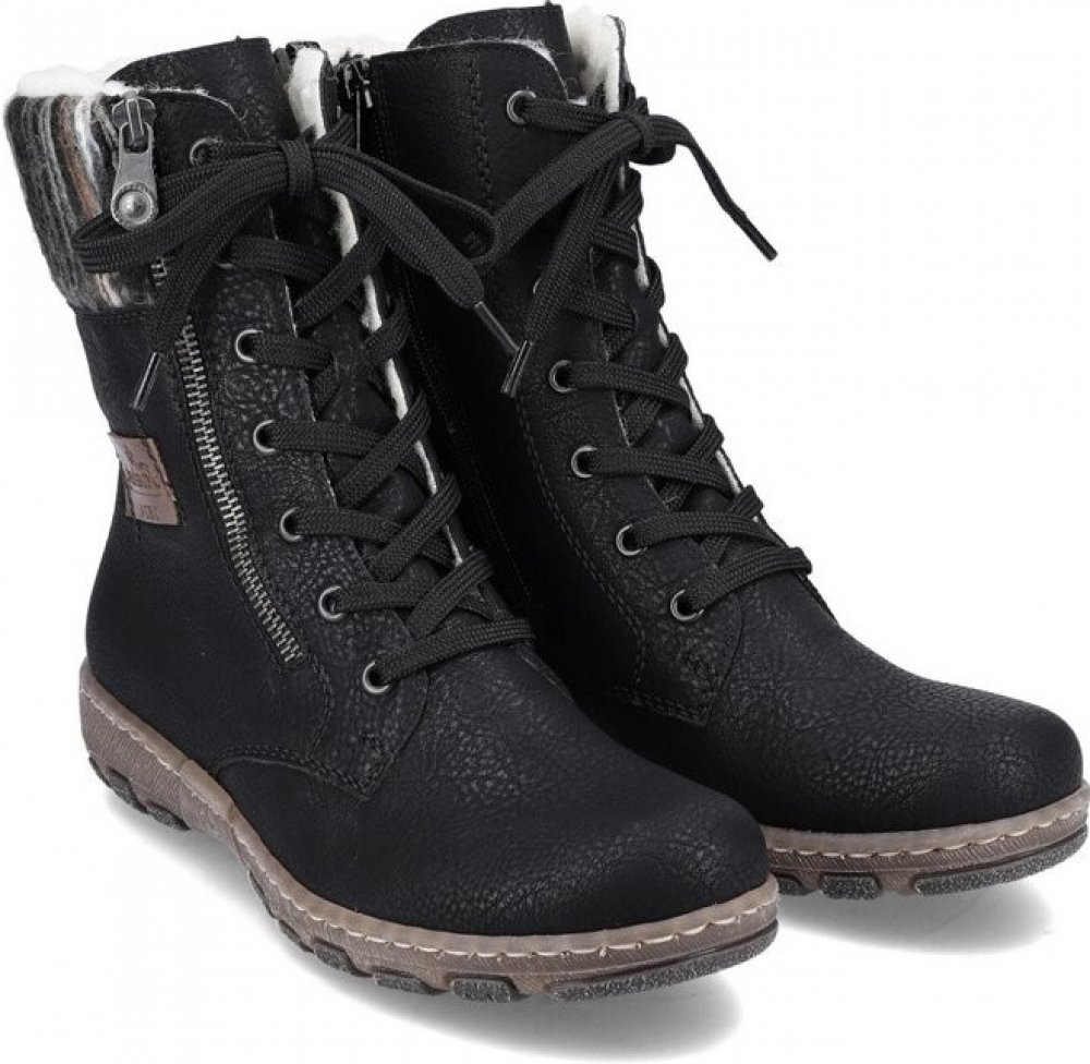 Dámské zateplené kotníkové boty značky Rieker se šněrováním a ozdobným nápletem v horní části. Díky pohodlné platformě jsou ideální ke každodennímu nošení. Teplá podšívka udrží vaše nohy v teple. Zip po straně slouží ke snadnému prozutí. Podešev:Podešev obuvi je s protiskluzovým vzorkem vyrobená ze syntetického materiálu. Je flexibilní díky ručnímu prošívání. (nutné impregnovat může propustit vodu ) Na platformě vysoké cca 2 Cm. Svršek:Svršek obuvi je vyrobený ze syntetického materiálu. Barva svršku je černá. Podšívka:Podšívka je zateplená, vyrobená z textilního filcu. Stélka: Stélka je vyrobená z textilního materiálu s Antistress vyměkčením. šířka:G Svršek: syntetika Podšívka: textil Stélka: textil Podešev: syntetika Šířka: g Vlastnosti obuvi:Antistress -Díky této technologii je obuv značkyznačky Riekerlehká, tlumí nárazy na páteř a snadno se přizpůsobí chodidlu.