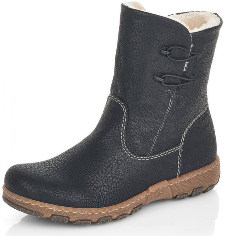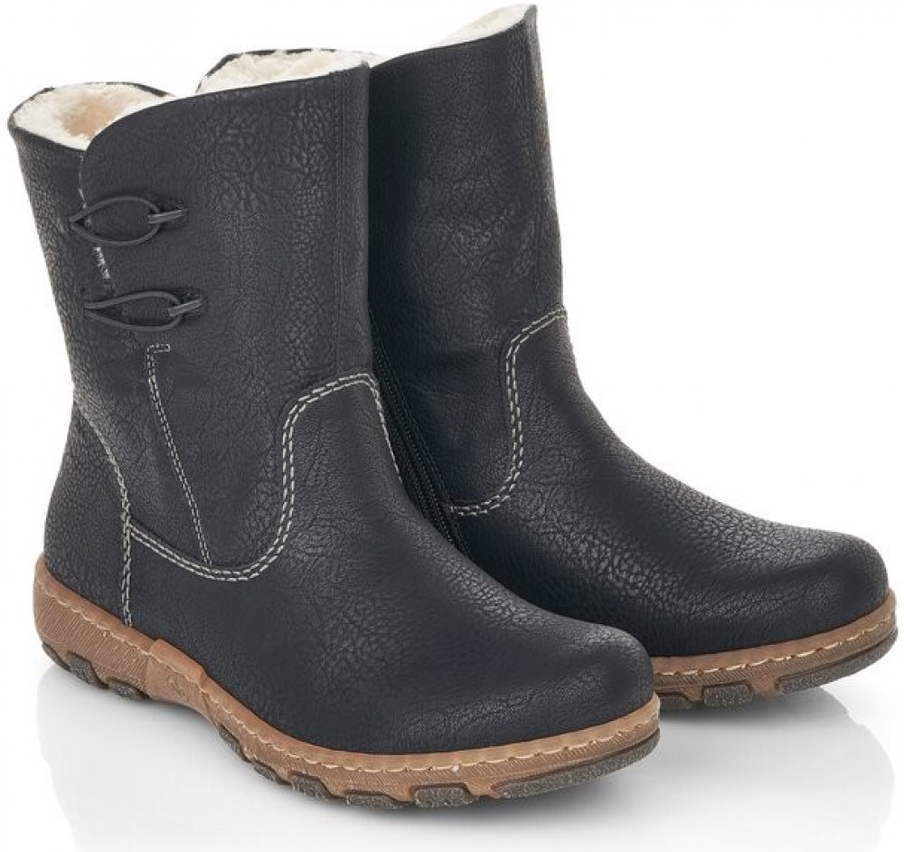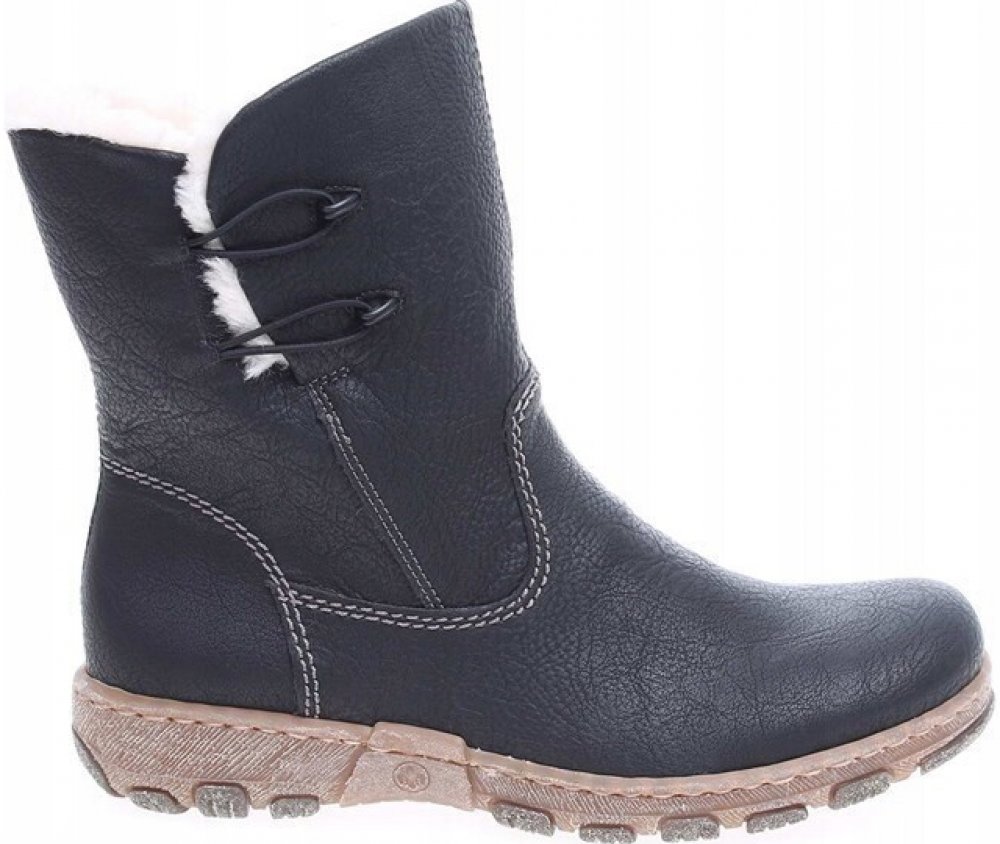 Vyšší kotníkové boty RIEKER s kontrastním prošitím a černým oblázkovým svrškem zaujmou vyčnívajícím bílým kožíškem. Funkční zip a pružné gumičky na vnější straně skvěle usnadní Vaše obutí. Podšívka z teplé kožešiny krásně zahřeje a podešev s hrubším vzorkem zajistí bezpečnou chůzi. Díky měkké stélce budou Vaše nohy jako v peřince. Ideální boty do zasněžených zimních dnů. Technologie: Antistress – podešev je díky této technologii lehká, flexibilní, absorbuje nárazy při došlapu a snadno se přizpůsobí každé noze.