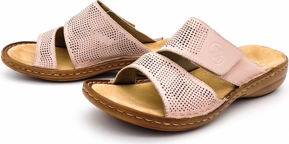 Dámské kožené pantofle s dvěma perforovanými pásky, pásek přes nárt je opatřen suchým zipem na zapínání. Stélka je látková, velmi příjemně vyměkčena.