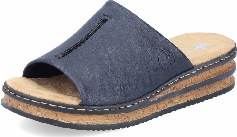 Dámské pantofle značky Rieker na pohodlné klínku. Modrý vzor se švem na nártu zaujme na první pohled. Díky vyměkčeným stélkám si je zamilujete.